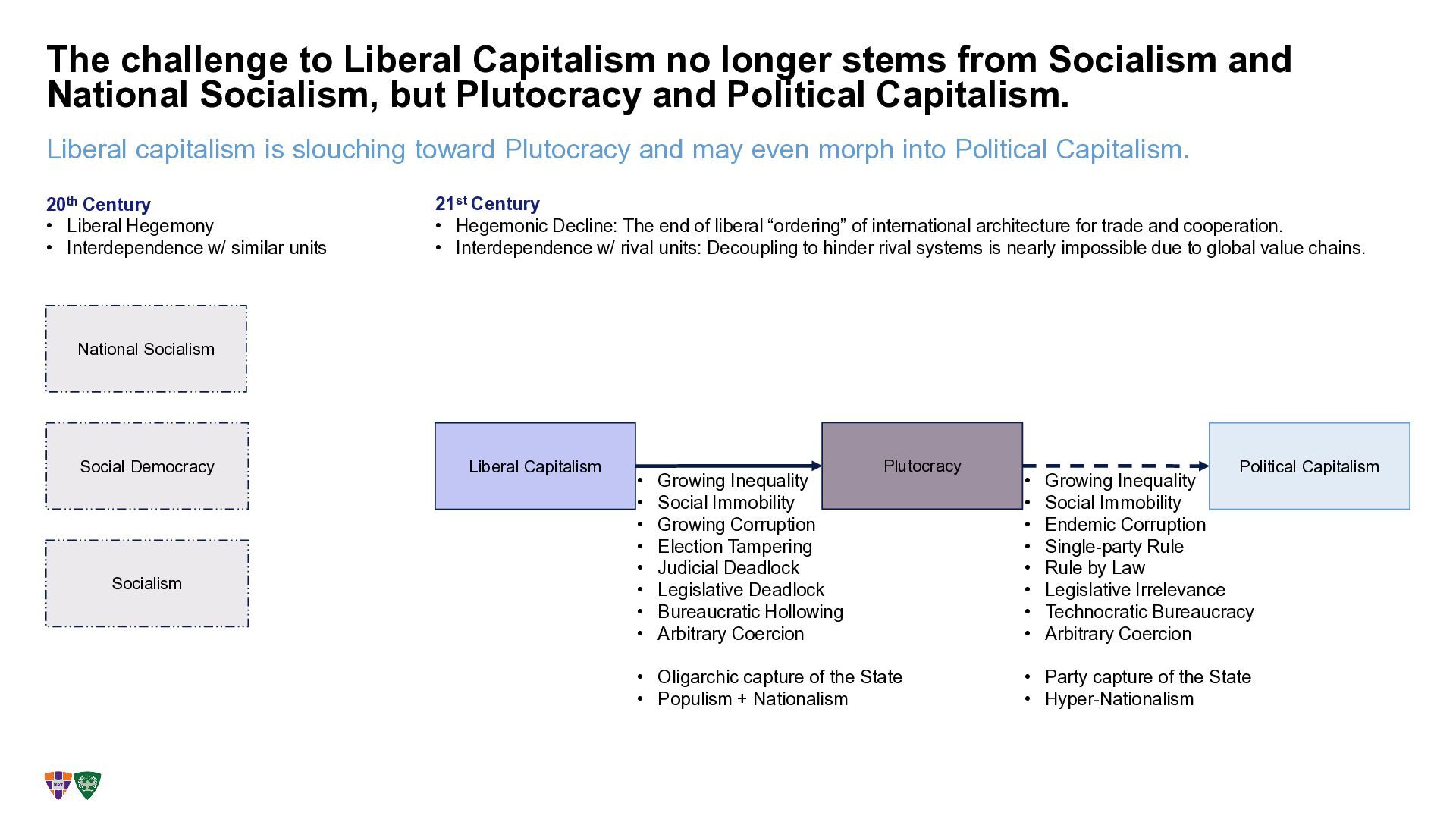 into Political Capitalism. The challenge to Liberal Capitalism no longer stems from Socialism and National Socialism, but Plutocracy and Political Capitalism. Political Capitalism Liberal Capitalism Plutocracy • Growing Inequality • Social Immobility • Growing Corruption • Election Tampering • Judicial Deadlock • Legislative Deadlock • Bureaucratic Hollowing • Arbitrary Coercion • Oligarchic capture of the State • Populism + Nationalism • Growing Inequality • Social Immobility • Endemic Corruption • Single-party Rule • Rule by Law • Legislative Irrelevance • Technocratic Bureaucracy • Arbitrary Coercion • Party capture of the State • Hyper-Nationalism National Socialism Socialism Social Democracy 20th Century 21st Century • Hegemonic Decline: The end of liberal “ordering” of international architecture for trade and cooperation. • Interdependence w/ rival units: Decoupling to hinder rival systems is nearly impossible due to global value chains. • Liberal Hegemony • Interdependence w/ similar units