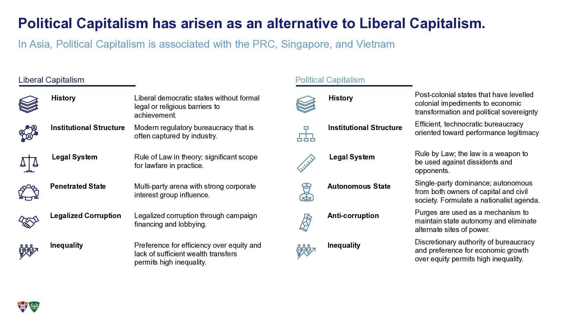 and Vietnam Political Capitalism has arisen as an alternative to Liberal Capitalism. Institutional Structure Legal System Penetrated State History Modern regulatory bureaucracy that is often captured by industry. Rule of Law in theory; significant scope for lawfare in practice. Multi-party arena with strong corporate interest group influence. Liberal democratic states without formal legal or religious barriers to achievement. Legalized Corruption Legalized corruption through campaign financing and lobbying. Inequality Preference for efficiency over equity and lack of sufficient wealth transfers permits high inequality. Institutional Structure Legal System Autonomous State History Efficient, technocratic bureaucracy oriented toward performance legitimacy Rule by Law; the law is a weapon to be used against dissidents and opponents. Single-party dominance; autonomous from both owners of capital and civil society. Formulate a nationalist agenda. Post-colonial states that have levelled colonial impediments to economic transformation and political sovereignty Anti-corruption Purges are used as a mechanism to maintain state autonomy and eliminate alternate sites of power. Inequality Discretionary authority of bureaucracy and preference for economic growth over equity permits high inequality. Liberal Capitalism Political Capitalism