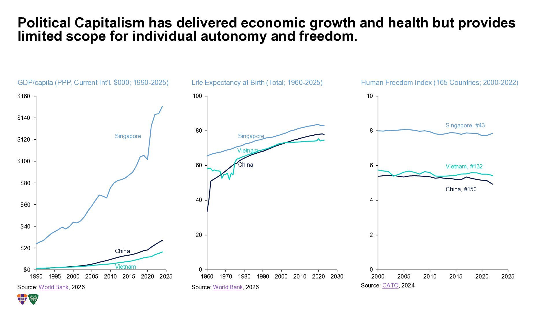 achieve higher GDP growth rates while providing a measure of human freedom, particularly economic freedom. 0% 1% 2% 3% 4% 5% 6% 7% 8% 9% 10% 0 1 2 3 4 5 6 7 8 9 10 Human Freedom Index GDP Growth Rate US UK CA CH CN VN SG MY more freedom less freedom lower growth higher growth 0 1 2 3 4 5 6 7 8 9 10 0 1 2 3 4 5 6 7 8 9 10 Personal Freedom Economic Freedom CH CA US UK SG MY VN CN Personal Freedom and Economic Freedom (2024) Source: World Bank, World Development Indicators 2026; CATO, Human Freedom Index 2025 Source: CATO, Human Freedom Index 2025 Liberal Capitalist states cannot compete on the basis on economic performance or even economic freedom. more personal freedom less personal freedom less economic freedom more economic freedom