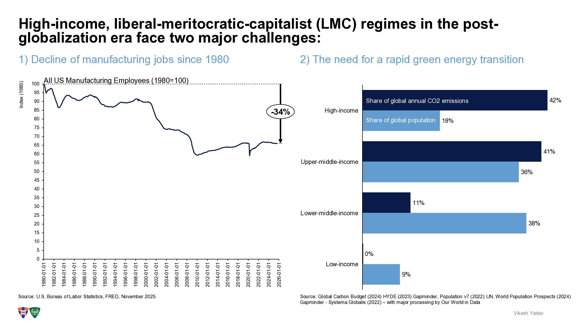 regimes in the post- globalization era face two major challenges: Vikash Yadav 2) The need for a rapid green energy transition 0 5 10 15 20 25 30 35 40 45 50 55 60 65 70 75 80 85 90 95 100 1980-01-01 1982-01-01 1984-01-01 1988-01-01 1990-01-01 1992-01-01 1994-01-01 1996-01-01 1998-01-01 2000-01-01 2002-01-01 2004-01-01 2006-01-01 2012-01-01 2018-01-01 2010-01-01 2020-01-01 2014-01-01 2022-01-01 2008-01-01 2024-01-01 2016-01-01 2026-01-01 1986-01-01 Index (1980) -34% All US Manufacturing Employees (1980=100) Source: U.S. Bureau of Labor Statistics, FRED, November 2025. 42% 41% 11% 0% 18% 36% 38% 9% High-income Upper-middle-income Lower-middle-income Low-income Source: Global Carbon Budget (2024) HYDE (2023) Gapminder, Population v7 (2022) UN, World Population Prospects (2024) Gapminder - Systema Globalis (2022) – with major processing by Our World in Data Share of global annual CO2 emissions Share of global population