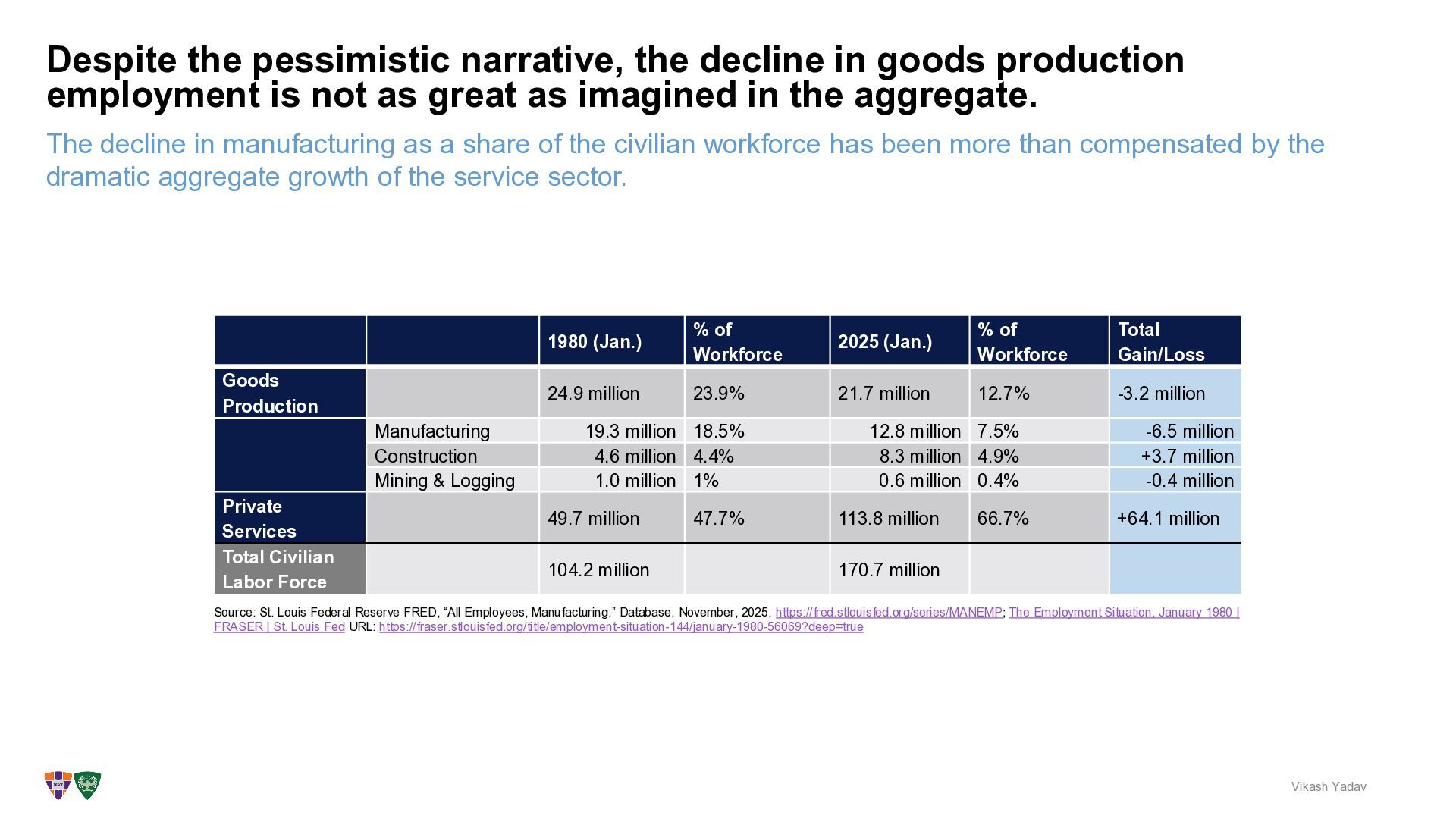 workforce has been more than compensated by the dramatic aggregate growth of the service sector. Despite the pessimistic narrative, the decline in goods production employment is not as great as imagined in the aggregate. Vikash Yadav 1980 (Jan.) % of Workforce 2025 (Jan.) % of Workforce Total Gain/Loss Goods Production 24.9 million 23.9% 21.7 million 12.7% -3.2 million Manufacturing 19.3 million 18.5% 12.8 million 7.5% -6.5 million Construction 4.6 million 4.4% 8.3 million 4.9% +3.7 million Mining & Logging 1.0 million 1% 0.6 million 0.4% -0.4 million Private Services 49.7 million 47.7% 113.8 million 66.7% +64.1 million Total Civilian Labor Force 104.2 million 170.7 million Source: St. Louis Federal Reserve FRED, “All Employees, Manufacturing,” Database, November, 2025, https://fred.stlouisfed.org/series/MANEMP; The Employment Situation, January 1980 | FRASER | St. Louis Fed URL: https://fraser.stlouisfed.org/title/employment-situation-144/january-1980-56069?deep=true