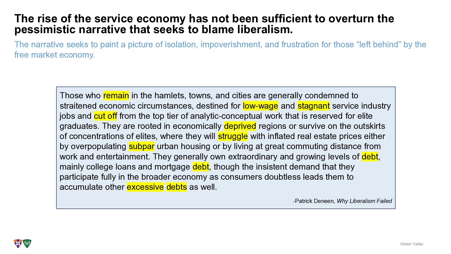 and frustration for those “left behind” by the free market economy. The rise of the service economy has not been sufficient to overturn the pessimistic narrative that seeks to blame liberalism. Vikash Yadav Those who remain in the hamlets, towns, and cities are generally condemned to straitened economic circumstances, destined for low-wage and stagnant service industry jobs and cut off from the top tier of analytic-conceptual work that is reserved for elite graduates. They are rooted in economically deprived regions or survive on the outskirts of concentrations of elites, where they will struggle with inflated real estate prices either by overpopulating subpar urban housing or by living at great commuting distance from work and entertainment. They generally own extraordinary and growing levels of debt, mainly college loans and mortgage debt, though the insistent demand that they participate fully in the broader economy as consumers doubtless leads them to accumulate other excessive debts as well. -Patrick Deneen, Why Liberalism Failed