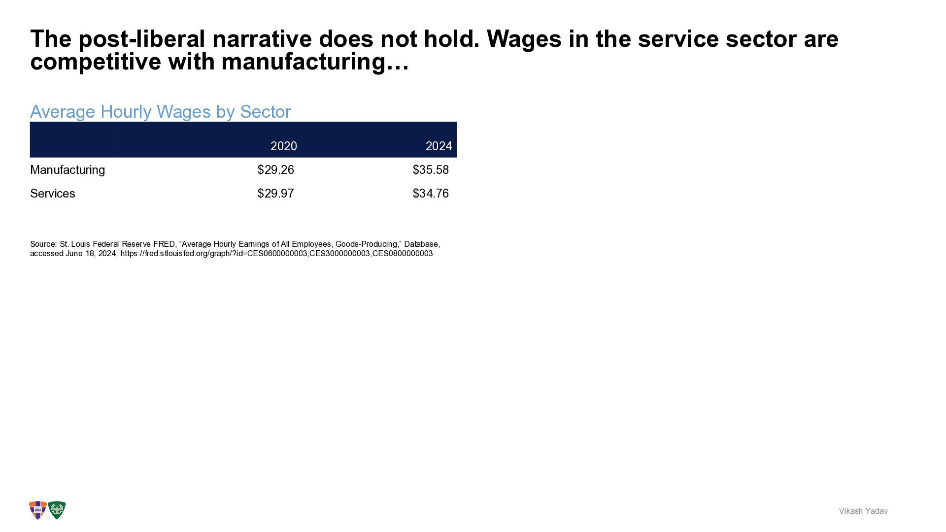 hold. Wages in the service sector are competitive with manufacturing… Vikash Yadav 2024 Manufacturing Services 2020 $29.97 $29.26 $34.76 $35.58 Source: St. Louis Federal Reserve FRED, “Average Hourly Earnings of All Employees, Goods-Producing,” Database, accessed June 18, 2024, https://fred.stlouisfed.org/graph/?id=CES0600000003,CES3000000003,CES0800000003