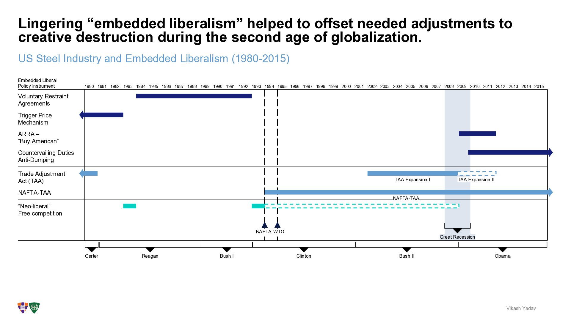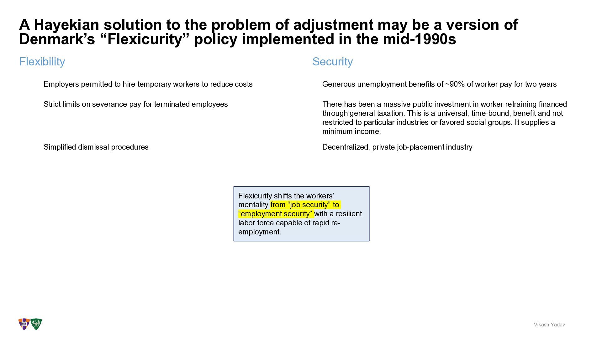 be a version of Denmark’s “Flexicurity” policy implemented in the mid-1990s Vikash Yadav Security Employers permitted to hire temporary workers to reduce costs Strict limits on severance pay for terminated employees Simplified dismissal procedures Generous unemployment benefits of ~90% of worker pay for two years There has been a massive public investment in worker retraining financed through general taxation. This is a universal, time-bound, benefit and not restricted to particular industries or favored social groups. It supplies a minimum income. Decentralized, private job-placement industry Flexicurity shifts the workers’ mentality from “job security” to “employment security” with a resilient labor force capable of rapid re- employment.