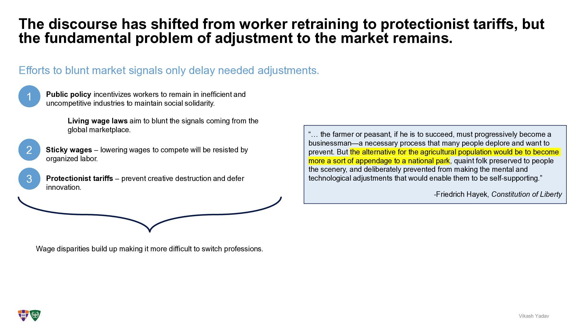 discourse has shifted from worker retraining to protectionist tariffs, but the fundamental problem of adjustment to the market remains. Vikash Yadav Sticky wages – lowering wages to compete will be resisted by organized labor. Living wage laws aim to blunt the signals coming from the global marketplace. Public policy incentivizes workers to remain in inefficient and uncompetitive industries to maintain social solidarity. “… the farmer or peasant, if he is to succeed, must progressively become a businessman—a necessary process that many people deplore and want to prevent. But the alternative for the agricultural population would be to become more a sort of appendage to a national park, quaint folk preserved to people the scenery, and deliberately prevented from making the mental and technological adjustments that would enable them to be self-supporting.” -Friedrich Hayek, Constitution of Liberty 1 2 3 Protectionist tariffs – prevent creative destruction and defer innovation. Wage disparities build up making it more difficult to switch professions.