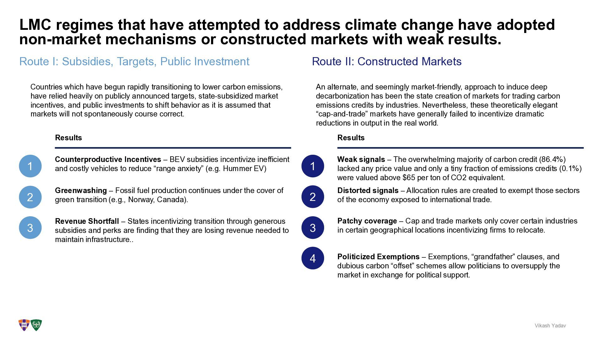 address climate change have adopted non-market mechanisms or constructed markets with weak results. Vikash Yadav Route I: Subsidies, Targets, Public Investment Countries which have begun rapidly transitioning to lower carbon emissions, have relied heavily on publicly announced targets, state-subsidized market incentives, and public investments to shift behavior as it is assumed that markets will not spontaneously course correct. Results Counterproductive Incentives – BEV subsidies incentivize inefficient and costly vehicles to reduce “range anxiety” (e.g. Hummer EV) Greenwashing – Fossil fuel production continues under the cover of green transition (e.g., Norway, Canada). Revenue Shortfall – States incentivizing transition through generous subsidies and perks are finding that they are losing revenue needed to maintain infrastructure.. 1 2 3 An alternate, and seemingly market-friendly, approach to induce deep decarbonization has been the state creation of markets for trading carbon emissions credits by industries. Nevertheless, these theoretically elegant “cap-and-trade” markets have generally failed to incentivize dramatic reductions in output in the real world. Results Weak signals – The overwhelming majority of carbon credit (86.4%) lacked any price value and only a tiny fraction of emissions credits (0.1%) were valued above $65 per ton of CO2 equivalent. 1 Distorted signals – Allocation rules are created to exempt those sectors of the economy exposed to international trade. 2 Patchy coverage – Cap and trade markets only cover certain industries in certain geographical locations incentivizing firms to relocate. 3 Politicized Exemptions – Exemptions, “grandfather” clauses, and dubious carbon “offset” schemes allow politicians to oversupply the market in exchange for political support. 4