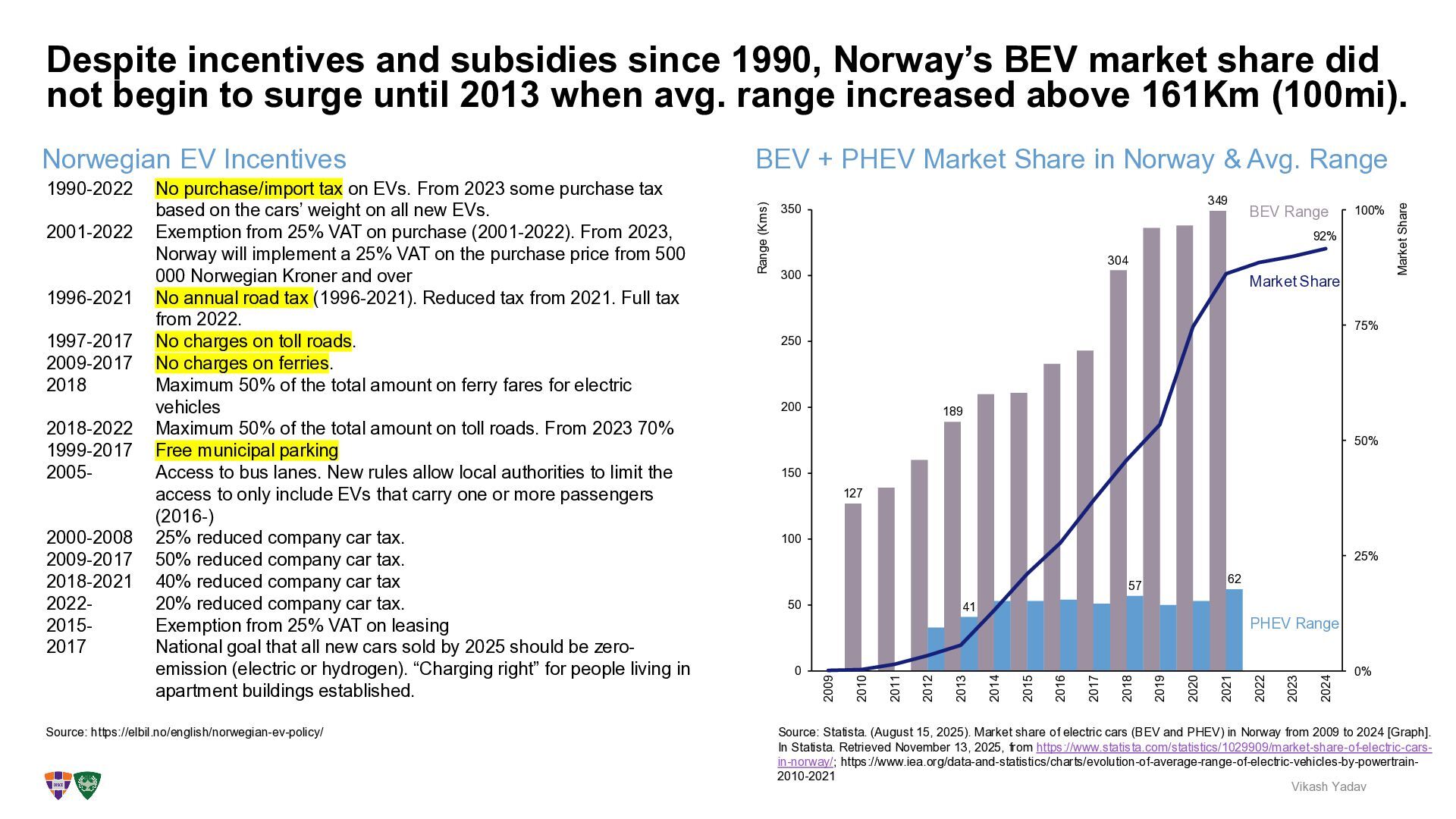 Despite incentives and subsidies since 1990, Norway’s BEV market share did not begin to surge until 2013 when avg. range increased above 161Km (100mi). Vikash Yadav Source: https://elbil.no/english/norwegian-ev-policy/ Norwegian EV Incentives 1990-2022 No purchase/import tax on EVs. From 2023 some purchase tax based on the cars’ weight on all new EVs. 2001-2022 Exemption from 25% VAT on purchase (2001-2022). From 2023, Norway will implement a 25% VAT on the purchase price from 500 000 Norwegian Kroner and over 1996-2021 No annual road tax (1996-2021). Reduced tax from 2021. Full tax from 2022. 1997-2017 No charges on toll roads. 2009-2017 No charges on ferries. 2018 Maximum 50% of the total amount on ferry fares for electric vehicles 2018-2022 Maximum 50% of the total amount on toll roads. From 2023 70% 1999-2017 Free municipal parking 2005- Access to bus lanes. New rules allow local authorities to limit the access to only include EVs that carry one or more passengers (2016-) 2000-2008 25% reduced company car tax. 2009-2017 50% reduced company car tax. 2018-2021 40% reduced company car tax 2022- 20% reduced company car tax. 2015- Exemption from 25% VAT on leasing 2017 National goal that all new cars sold by 2025 should be zero- emission (electric or hydrogen). “Charging right” for people living in apartment buildings established. Source: Statista. (August 15, 2025). Market share of electric cars (BEV and PHEV) in Norway from 2009 to 2024 [Graph]. In Statista. Retrieved November 13, 2025, from https://www.statista.com/statistics/1029909/market-share-of-electric-cars- in-norway/; https://www.iea.org/data-and-statistics/charts/evolution-of-average-range-of-electric-vehicles-by-powertrain- 2010-2021 127 189 304 349 41 57 62 0 50 100 150 200 250 300 350 0% 25% 50% 75% 100% Range (Kms) Market Share 2009 2010 2011 2012 2013 2014 2015 2016 2017 2018 2019 2020 2021 2022 2023 2024 92% PHEV Range Market Share BEV Range