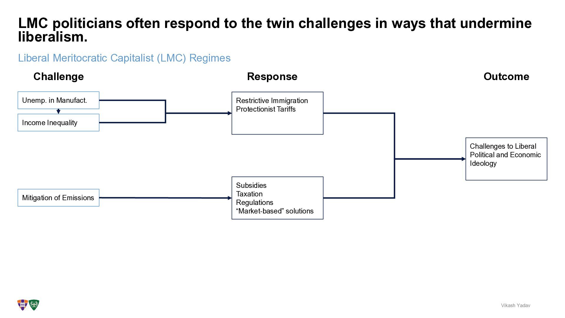 the twin challenges in ways that undermine liberalism. Vikash Yadav Challenge Unemp. in Manufact. Income Inequality Restrictive Immigration Protectionist Tariffs Challenges to Liberal Political and Economic Ideology Mitigation of Emissions Subsidies Taxation Regulations “Market-based” solutions Response Outcome