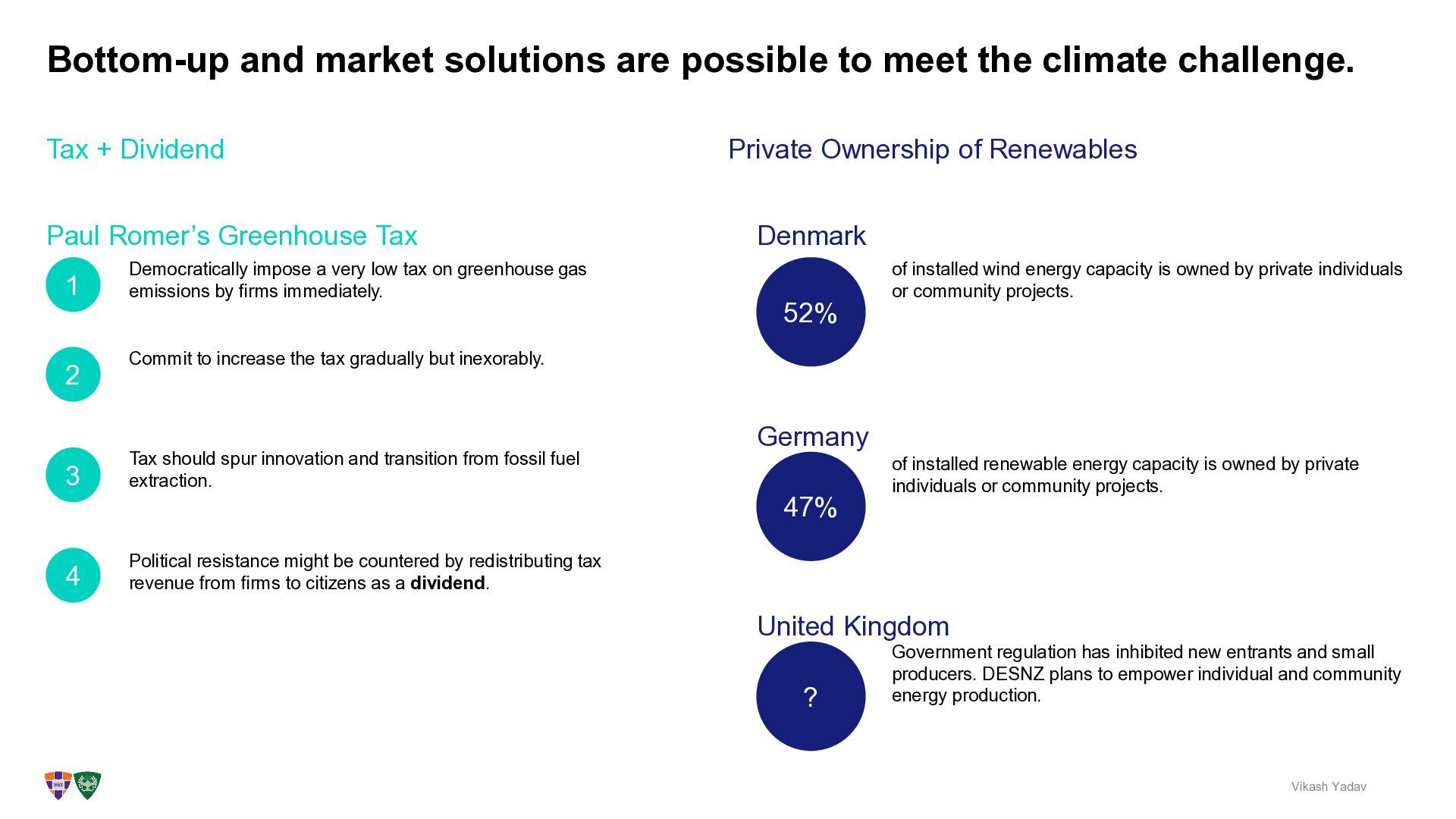 meet the climate challenge. Vikash Yadav of installed wind energy capacity is owned by private individuals or community projects. 52% Germany of installed renewable energy capacity is owned by private individuals or community projects. 47% Private Ownership of Renewables Denmark Democratically impose a very low tax on greenhouse gas emissions by firms immediately. Paul Romer’s Greenhouse Tax 1 Commit to increase the tax gradually but inexorably. 2 Political resistance might be countered by redistributing tax revenue from firms to citizens as a dividend. 4 3 Tax should spur innovation and transition from fossil fuel extraction. United Kingdom ? Government regulation has inhibited new entrants and small producers. DESNZ plans to empower individual and community energy production.