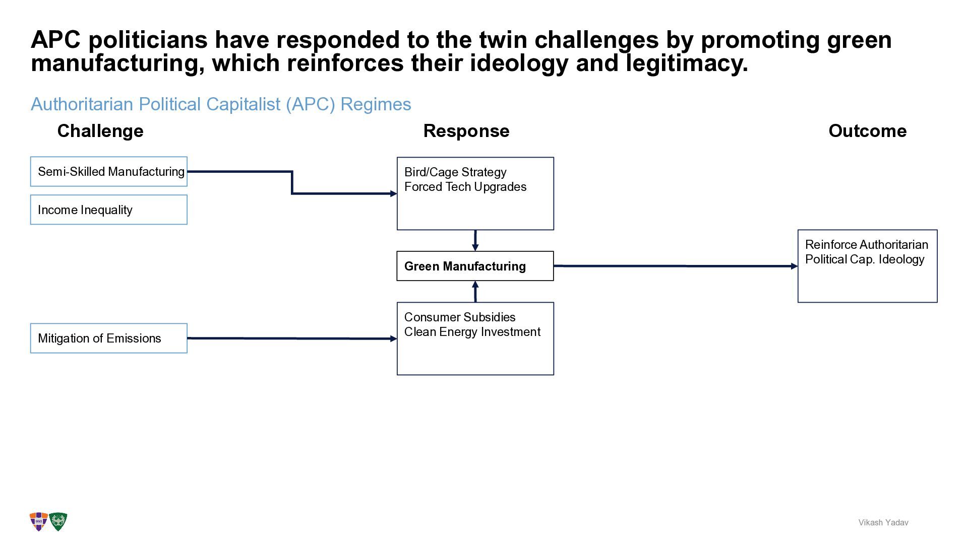 green manufacturing, which reinforces their ideology and legitimacy. Vikash Yadav Authoritarian Political Capitalist (APC) Regimes Challenge Semi-Skilled Manufacturing Green Manufacturing Bird/Cage Strategy Forced Tech Upgrades Reinforce Authoritarian Political Cap. Ideology Mitigation of Emissions Consumer Subsidies Clean Energy Investment Response Outcome Income Inequality