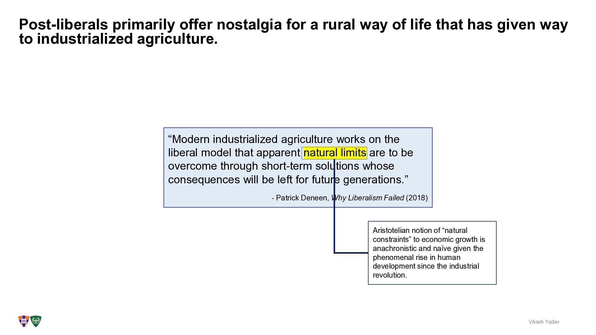 that has given way to industrialized agriculture. Vikash Yadav “Modern industrialized agriculture works on the liberal model that apparent natural limits are to be overcome through short-term solutions whose consequences will be left for future generations.” - Patrick Deneen, Why Liberalism Failed (2018) Aristotelian notion of “natural constraints” to economic growth is anachronistic and naïve given the phenomenal rise in human development since the industrial revolution.
