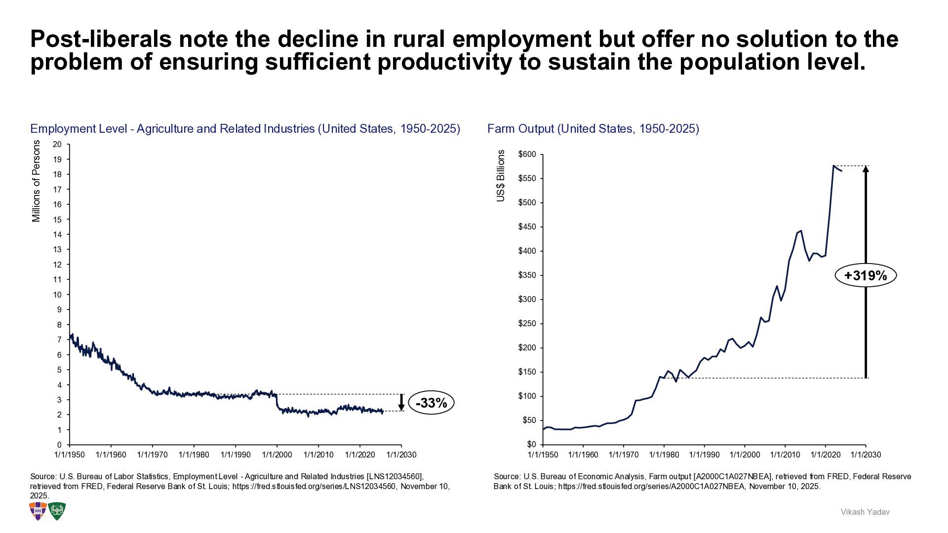 solution to the problem of ensuring sufficient productivity to sustain the population level. Vikash Yadav 1/1/1970 1/1/1950 1/1/1980 1/1/1990 1/1/2000 1/1/2010 1/1/2020 1/1/2030 0 1 2 3 4 5 6 7 8 9 10 11 12 13 14 1/1/1960 16 17 18 19 15 20 Millions of Persons -33% Employment Level - Agriculture and Related Industries (United States, 1950-2025) Source: U.S. Bureau of Labor Statistics, Employment Level - Agriculture and Related Industries [LNS12034560], retrieved from FRED, Federal Reserve Bank of St. Louis; https://fred.stlouisfed.org/series/LNS12034560, November 10, 2025. $0 $50 $100 $150 $200 $250 $300 $350 $400 $450 $500 $550 $600 1/1/2000 1/1/1960 1/1/1980 1/1/2020 1/1/1950 1/1/1970 1/1/1990 1/1/2010 1/1/2030 US$ Billions +319% Farm Output (United States, 1950-2025) Source: U.S. Bureau of Economic Analysis, Farm output [A2000C1A027NBEA], retrieved from FRED, Federal Reserve Bank of St. Louis; https://fred.stlouisfed.org/series/A2000C1A027NBEA, November 10, 2025.