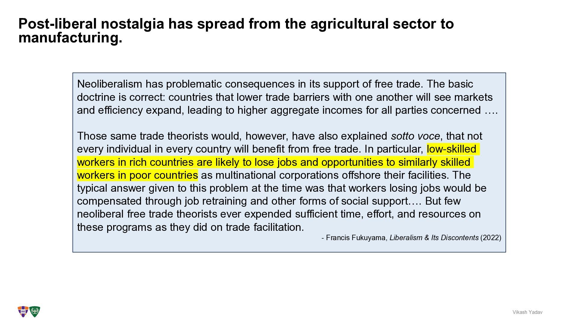 Vikash Yadav Neoliberalism has problematic consequences in its support of free trade. The basic doctrine is correct: countries that lower trade barriers with one another will see markets and efficiency expand, leading to higher aggregate incomes for all parties concerned …. Those same trade theorists would, however, have also explained sotto voce, that not every individual in every country will benefit from free trade. In particular, low-skilled workers in rich countries are likely to lose jobs and opportunities to similarly skilled workers in poor countries as multinational corporations offshore their facilities. The typical answer given to this problem at the time was that workers losing jobs would be compensated through job retraining and other forms of social support…. But few neoliberal free trade theorists ever expended sufficient time, effort, and resources on these programs as they did on trade facilitation. - Francis Fukuyama, Liberalism & Its Discontents (2022)