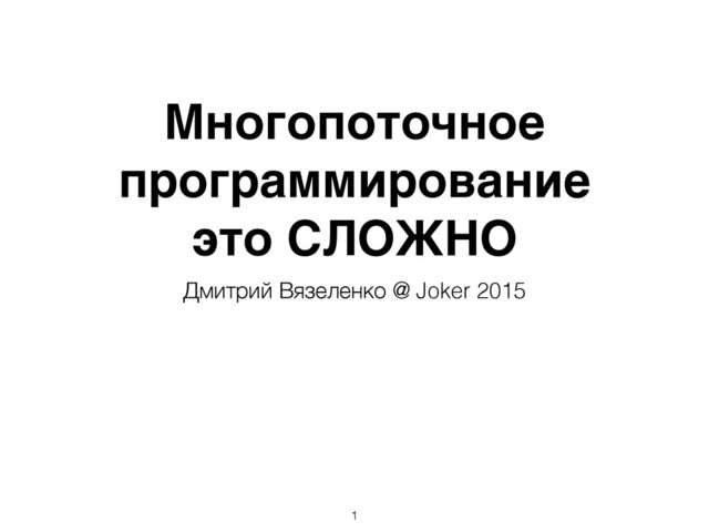 Писать корректные однопоточные приложения сложно. Писать корректные многопоточные приложения на несколько порядков сложнее. Потому что, все, что может поломаться в однопоточном приложении, может также сломаться и в многопоточном, но в добавок к этому много других подводных камней скрываются под потоками. В этом докладе я хочу рассказать о том, что делает многопоточное программирование таким сложным: начиная с хардвара и двигаясь по всему софтверному стэку (ОС, рантайм, приложение). Поговорим про то, какие фундаментальные вещи полезно знать и о чем стоит помнить прежде чем нырять с головой в многопоточность. А еще мы рассмотрим какие альтернативные модели многопоточности существуют и как они могут упростить нам жизнь.