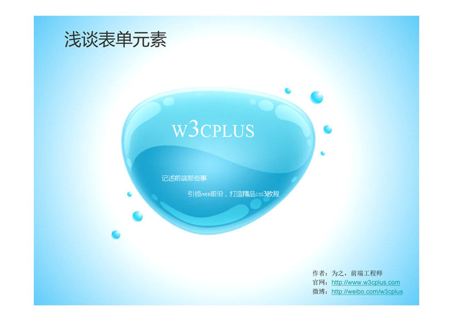 浅谈表单元素 作者:为之,前端工程师 官网:http://www.w3cplus.com 微博:http://weibo.com/w3cplus