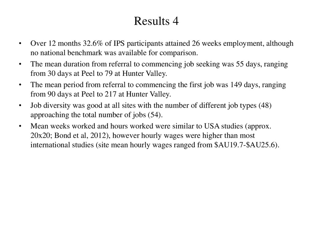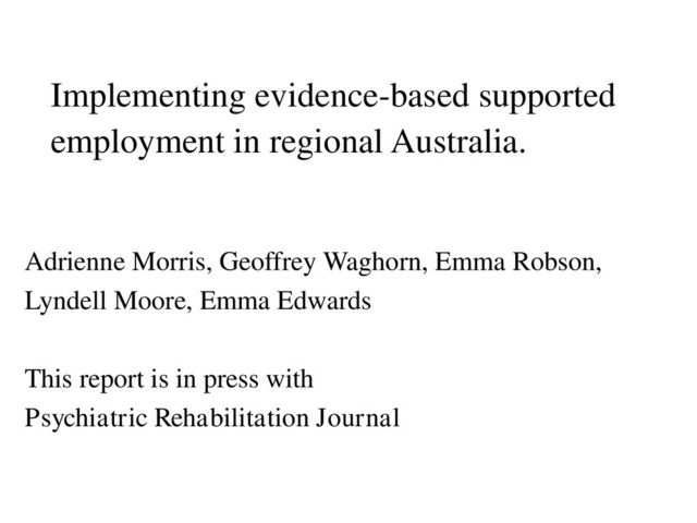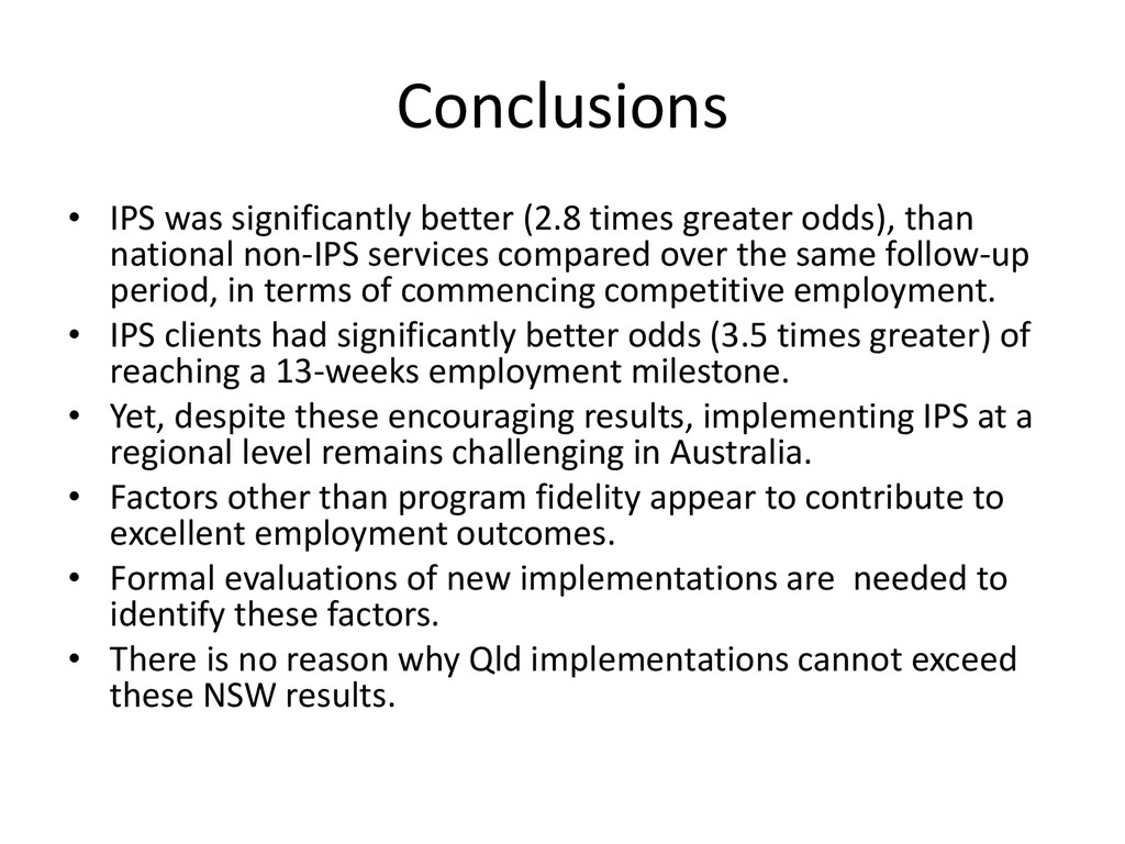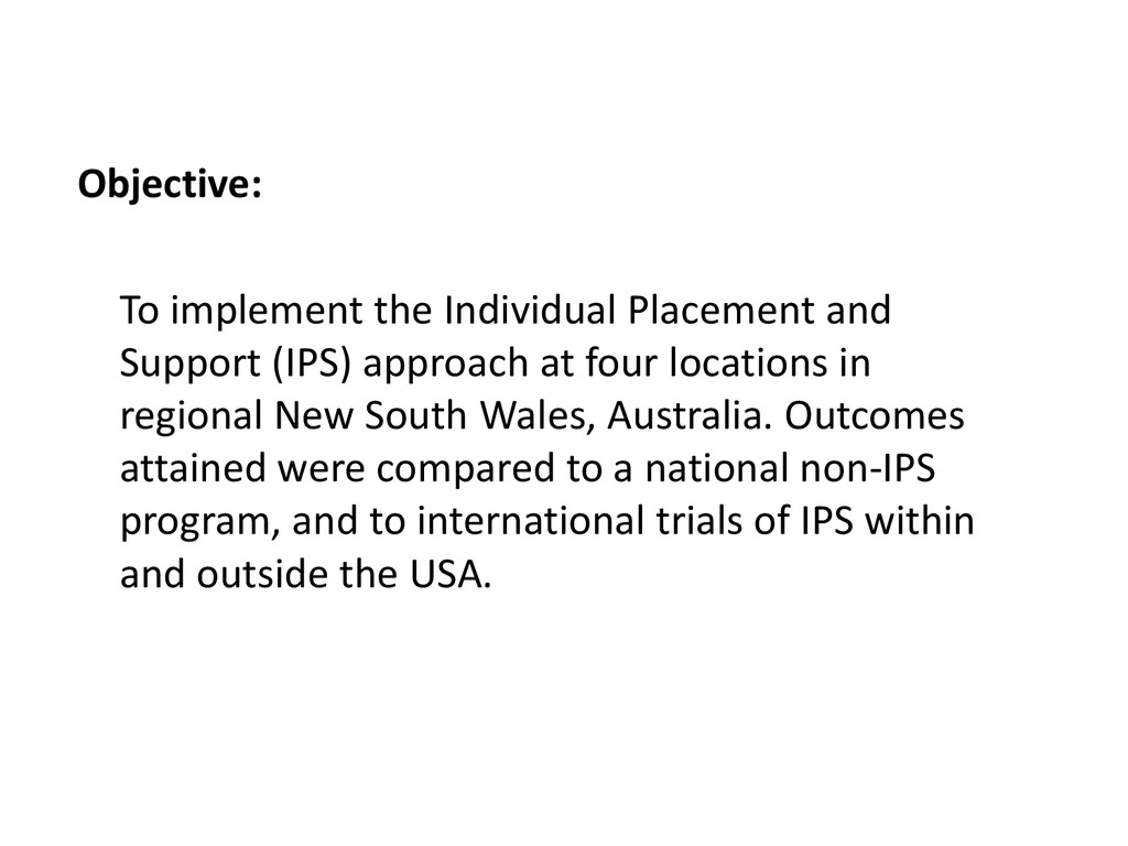 The Individual Placement and Support (IPS) approach was implemented across regional New South Wales, with encouraging results in employment outcomes compared to national non-IPS services. Challenges with implementing IPS nationwide are discussed, with ways to overcome potential barriers.