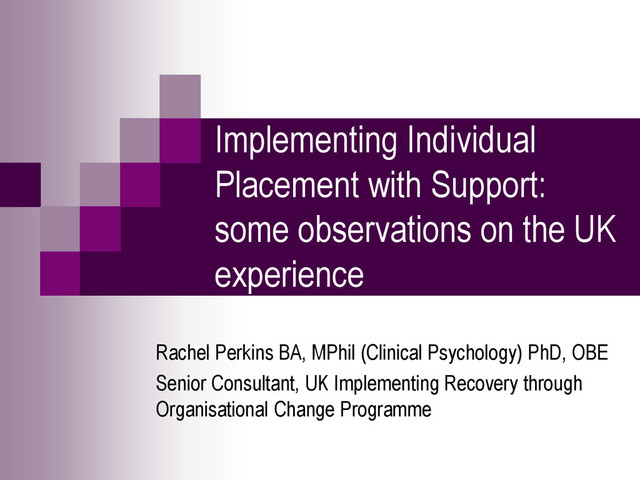 base In the UK there is an enormous investment (personal and financial) in existing ways of doing things on the part of service providers, people who use mental health services, politicians and the public and people with mental health conditions (especially sheltered work and pre-vocational training) Many people are ignorant of or disbelieve the evidence Problem: IPS evidence based supported employment principles challenge some traditional assumptions that are commonly held among professionals, employers, the ‘general public’ and people with mental health conditions ...