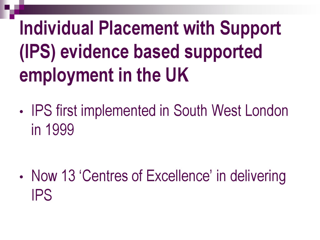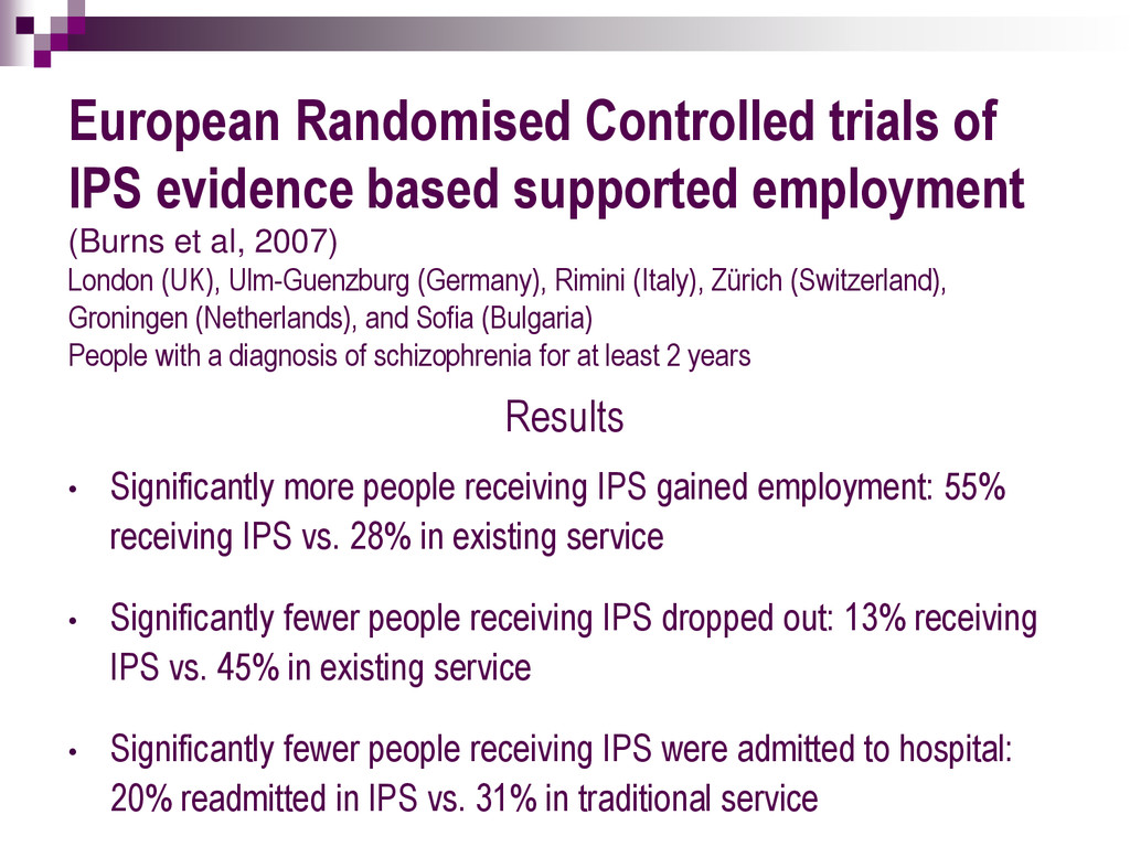 (Burns et al, 2007) London (UK), Ulm-Guenzburg (Germany), Rimini (Italy), Zürich (Switzerland), Groningen (Netherlands), and Sofia (Bulgaria) People with a diagnosis of schizophrenia for at least 2 years Results • Significantly more people receiving IPS gained employment: 55% receiving IPS vs. 28% in existing service • Significantly fewer people receiving IPS dropped out: 13% receiving IPS vs. 45% in existing service • Significantly fewer people receiving IPS were admitted to hospital: 20% readmitted in IPS vs. 31% in traditional service