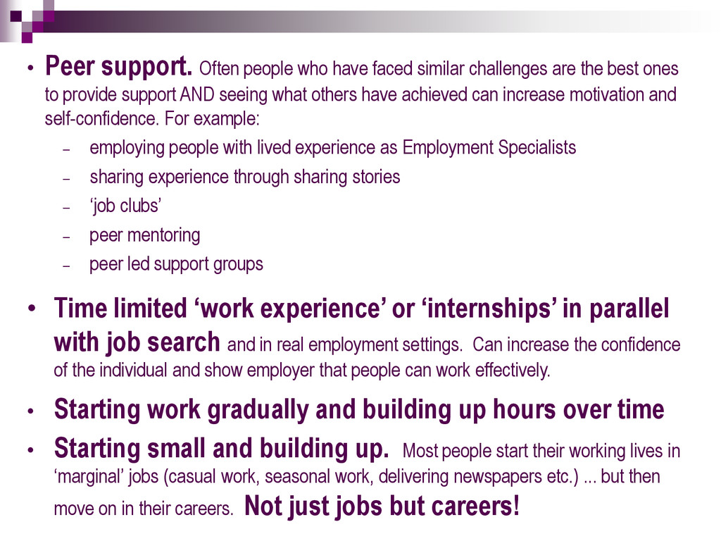 are the best ones to provide support AND seeing what others have achieved can increase motivation and self-confidence. For example: – employing people with lived experience as Employment Specialists – sharing experience through sharing stories – ‘job clubs’ – peer mentoring – peer led support groups • Time limited ‘work experience’ or ‘internships’ in parallel with job search and in real employment settings. Can increase the confidence of the individual and show employer that people can work effectively. • Starting work gradually and building up hours over time • Starting small and building up. Most people start their working lives in ‘marginal’ jobs (casual work, seasonal work, delivering newspapers etc.) ... but then move on in their careers. Not just jobs but careers!