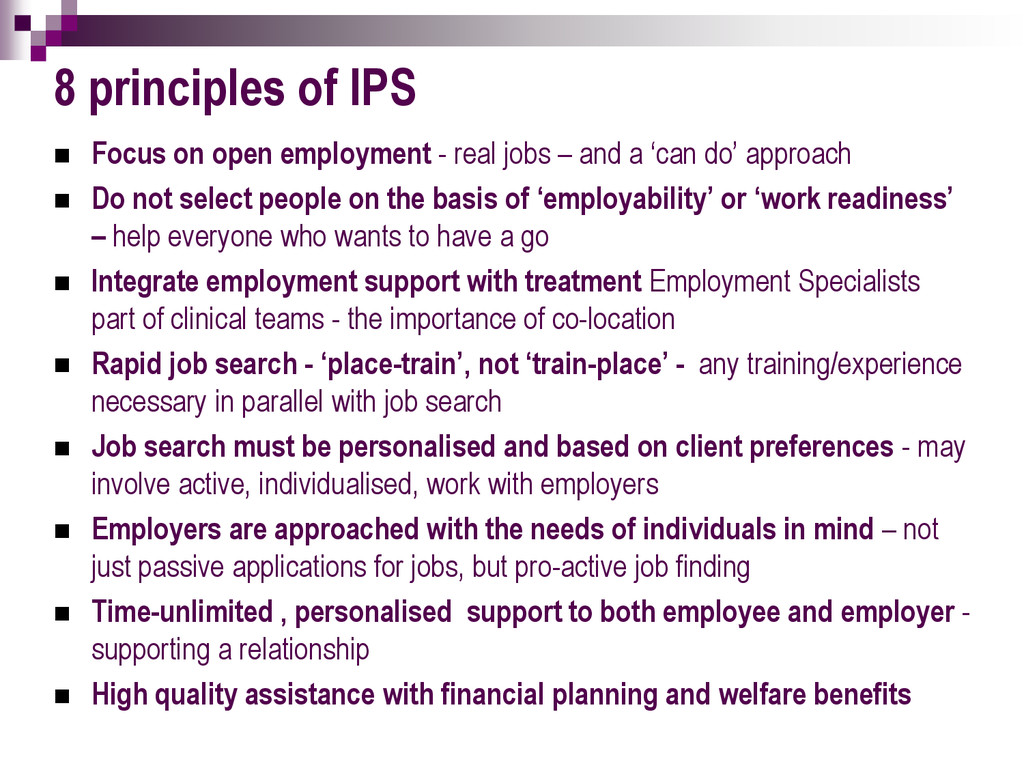 real jobs – and a ‘can do’ approach Do not select people on the basis of ‘employability’ or ‘work readiness’ – help everyone who wants to have a go Integrate employment support with treatment Employment Specialists part of clinical teams - the importance of co-location Rapid job search - ‘place-train’, not ‘train-place’ - any training/experience necessary in parallel with job search Job search must be personalised and based on client preferences - may involve active, individualised, work with employers Employers are approached with the needs of individuals in mind – not just passive applications for jobs, but pro-active job finding Time-unlimited , personalised support to both employee and employer - supporting a relationship High quality assistance with financial planning and welfare benefits