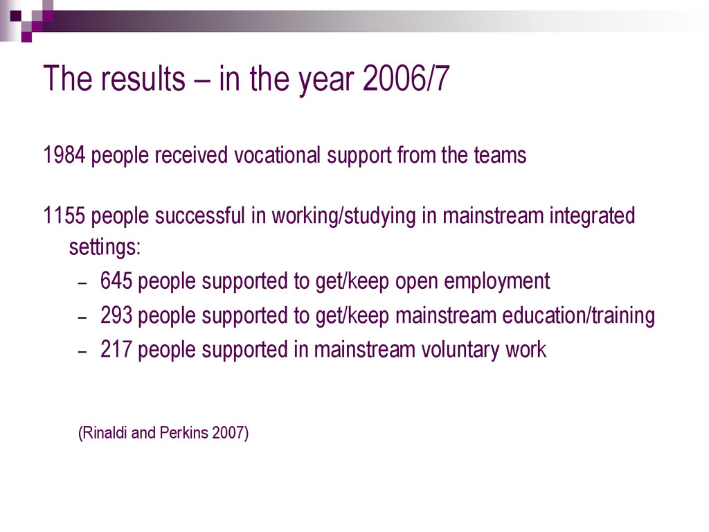 vocational support from the teams 1155 people successful in working/studying in mainstream integrated settings: – 645 people supported to get/keep open employment – 293 people supported to get/keep mainstream education/training – 217 people supported in mainstream voluntary work (Rinaldi and Perkins 2007)