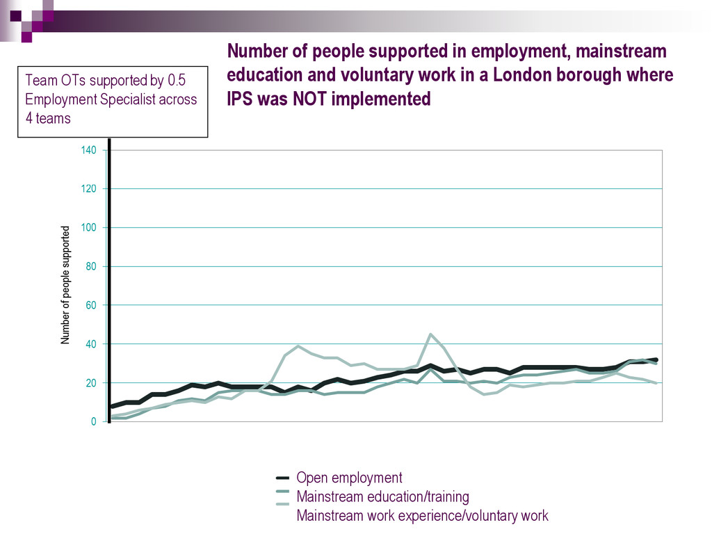 Jun-02 Aug-02 Oct-02 Dec-02 Feb-03 Apr-03 Jun-03 Aug-03 Oct-03 Dec-03 Feb-04 Apr-04 Jun-04 Aug-04 Oct-04 Dec-04 Feb-05 Apr-05 Number of people supported Open employment Mainstyream education/training Mainstream work experience/voluntary work Team OTs supported by 1 Employment Specialist across 4 teams 0.5 Employment Specialists per CMHT 1 full-time Employment Specialist per CMHT Open employment Mainstream education/training Mainstream work experience/voluntary work Number of people supported in employment, mainstream education and voluntary work in a London borough where IPS was implemented in all community teams