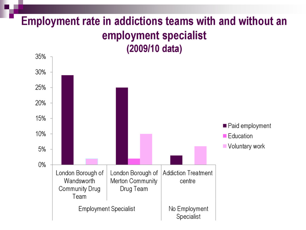 of Wandsworth Community Drug Team London Borough of Merton Community Drug Team Addiction Treatment centre Employment Specialist No Employment Specialist Paid employment Education Voluntary work Employment rate in addictions teams with and without an employment specialist (2009/10 data)