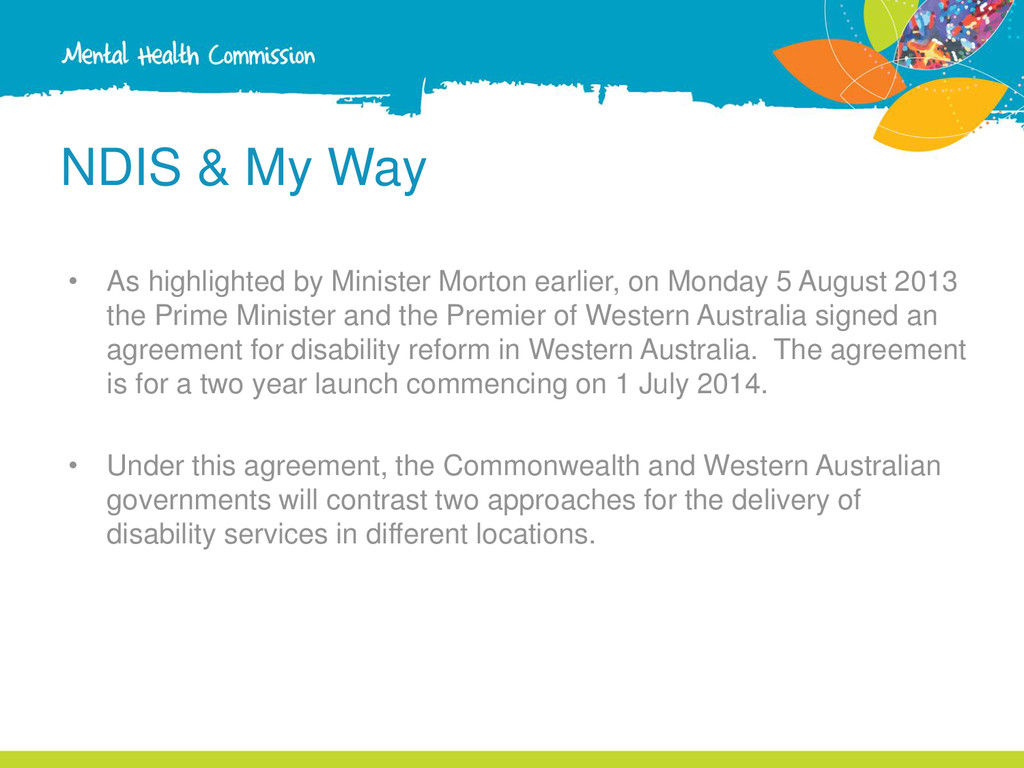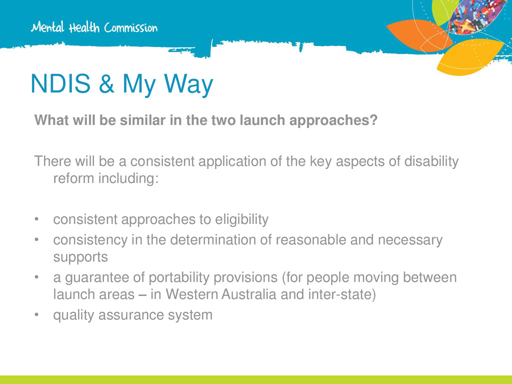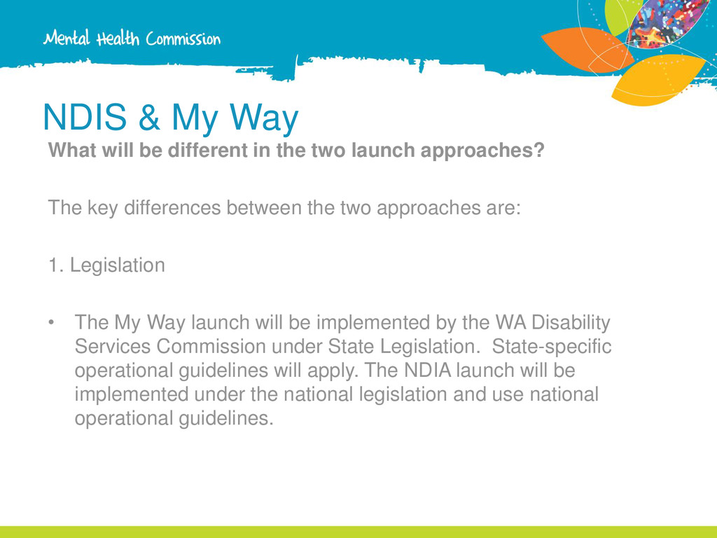 two launch approaches? The key differences between the two approaches are: 1. Legislation • The My Way launch will be implemented by the WA Disability Services Commission under State Legislation. State-specific operational guidelines will apply. The NDIA launch will be implemented under the national legislation and use national operational guidelines.