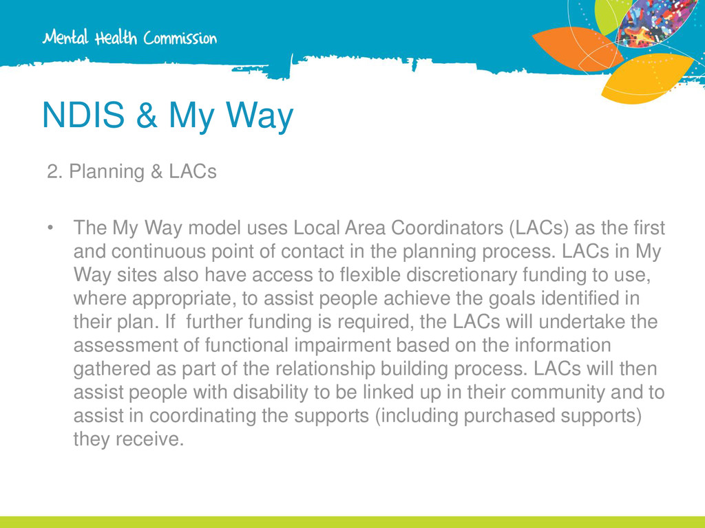 My Way model uses Local Area Coordinators (LACs) as the first and continuous point of contact in the planning process. LACs in My Way sites also have access to flexible discretionary funding to use, where appropriate, to assist people achieve the goals identified in their plan. If further funding is required, the LACs will undertake the assessment of functional impairment based on the information gathered as part of the relationship building process. LACs will then assist people with disability to be linked up in their community and to assist in coordinating the supports (including purchased supports) they receive.