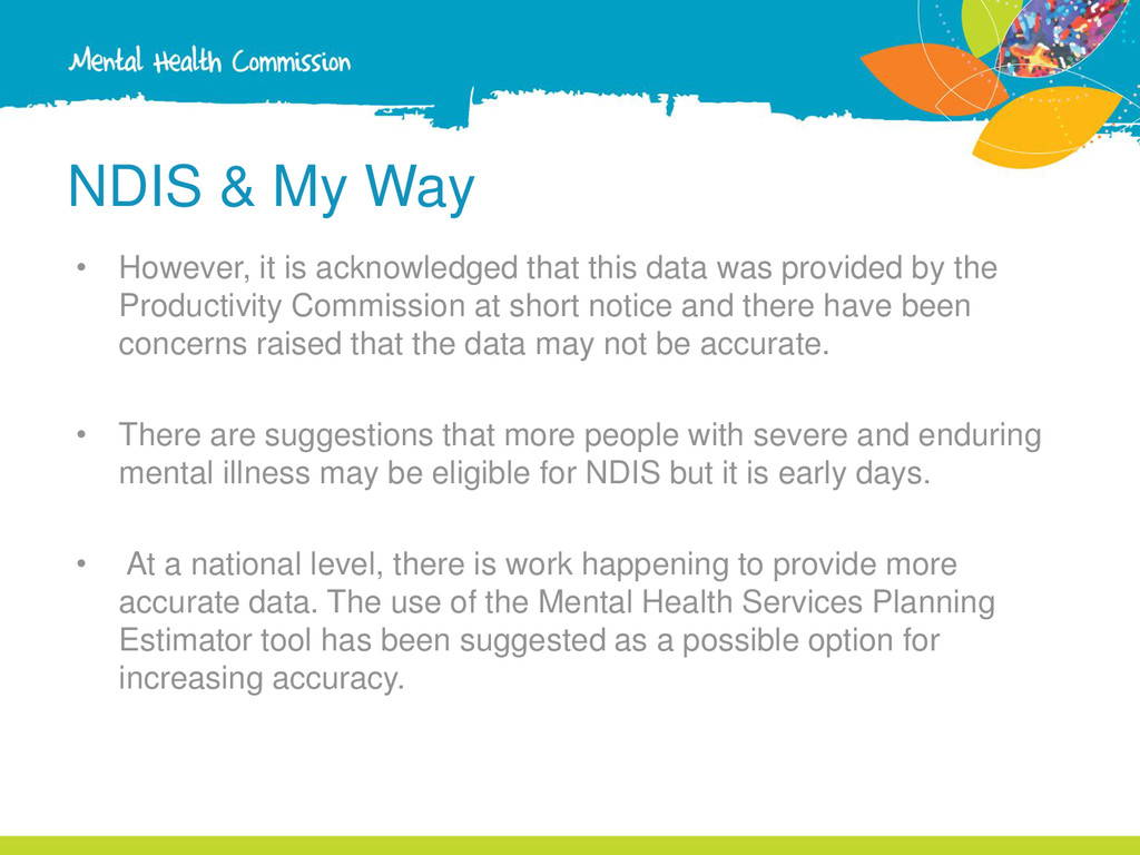 this data was provided by the Productivity Commission at short notice and there have been concerns raised that the data may not be accurate. • There are suggestions that more people with severe and enduring mental illness may be eligible for NDIS but it is early days. • At a national level, there is work happening to provide more accurate data. The use of the Mental Health Services Planning Estimator tool has been suggested as a possible option for increasing accuracy.
