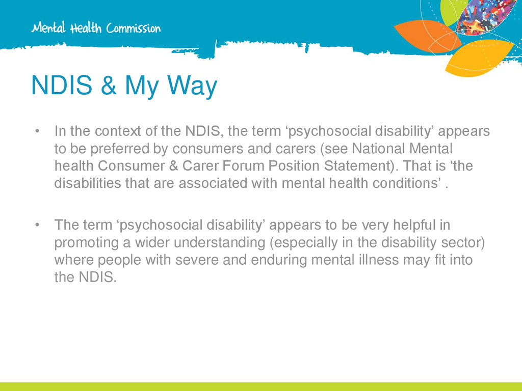 NDIS, the term ‘psychosocial disability’ appears to be preferred by consumers and carers (see National Mental health Consumer & Carer Forum Position Statement). That is ‘the disabilities that are associated with mental health conditions’ . • The term ‘psychosocial disability’ appears to be very helpful in promoting a wider understanding (especially in the disability sector) where people with severe and enduring mental illness may fit into the NDIS.