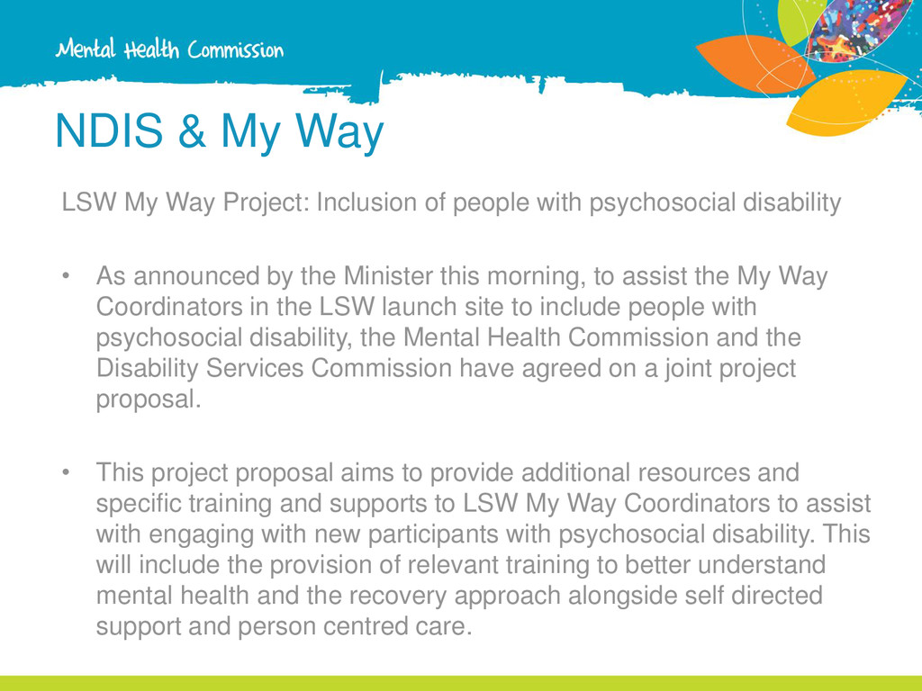 people with psychosocial disability • As announced by the Minister this morning, to assist the My Way Coordinators in the LSW launch site to include people with psychosocial disability, the Mental Health Commission and the Disability Services Commission have agreed on a joint project proposal. • This project proposal aims to provide additional resources and specific training and supports to LSW My Way Coordinators to assist with engaging with new participants with psychosocial disability. This will include the provision of relevant training to better understand mental health and the recovery approach alongside self directed support and person centred care.