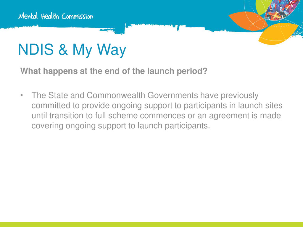 the launch period? • The State and Commonwealth Governments have previously committed to provide ongoing support to participants in launch sites until transition to full scheme commences or an agreement is made covering ongoing support to launch participants.
