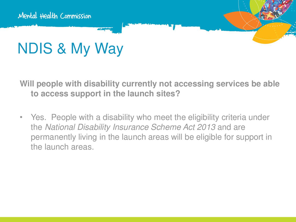 for support in the launch sites? • In total, approximately 8,400 eligible participants (with permanent disability) in Western Australia will benefit over the launch period. Who will be eligible for support in the launch areas? • The eligibility criteria developed for NDIA (as set out in the National Disability Insurance Scheme Act 2013) will be used in both of the Western Australian launch models. The My Way model will use the same eligibility rules that will apply across the nation. • Both of the Western Australian launch approaches will apply to all eligible people under 65 at the time of launch, rather than being limited to more specific age cohorts.