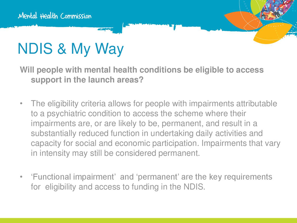 be eligible to access support in the launch areas? • The eligibility criteria allows for people with impairments attributable to a psychiatric condition to access the scheme where their impairments are, or are likely to be, permanent, and result in a substantially reduced function in undertaking daily activities and capacity for social and economic participation. Impairments that vary in intensity may still be considered permanent. • ‘Functional impairment’ and ‘permanent’ are the key requirements for eligibility and access to funding in the NDIS.