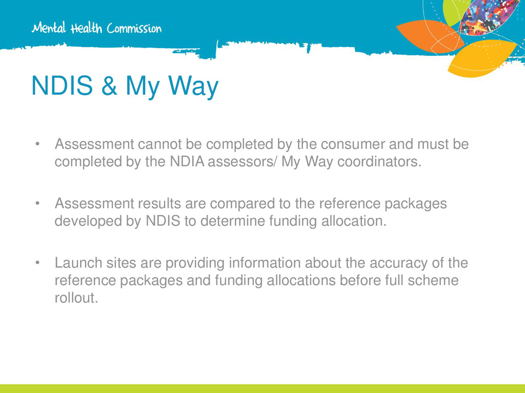 the consumer and must be completed by the NDIA assessors/ My Way coordinators. • Assessment results are compared to the reference packages developed by NDIS to determine funding allocation. • Launch sites are providing information about the accuracy of the reference packages and funding allocations before full scheme rollout.