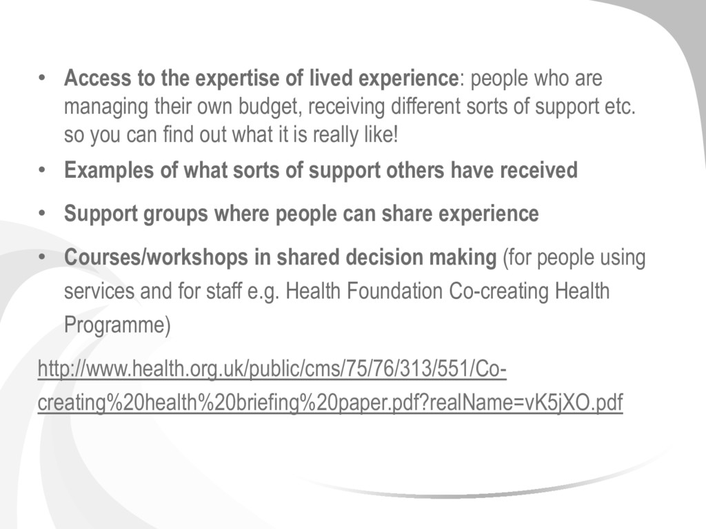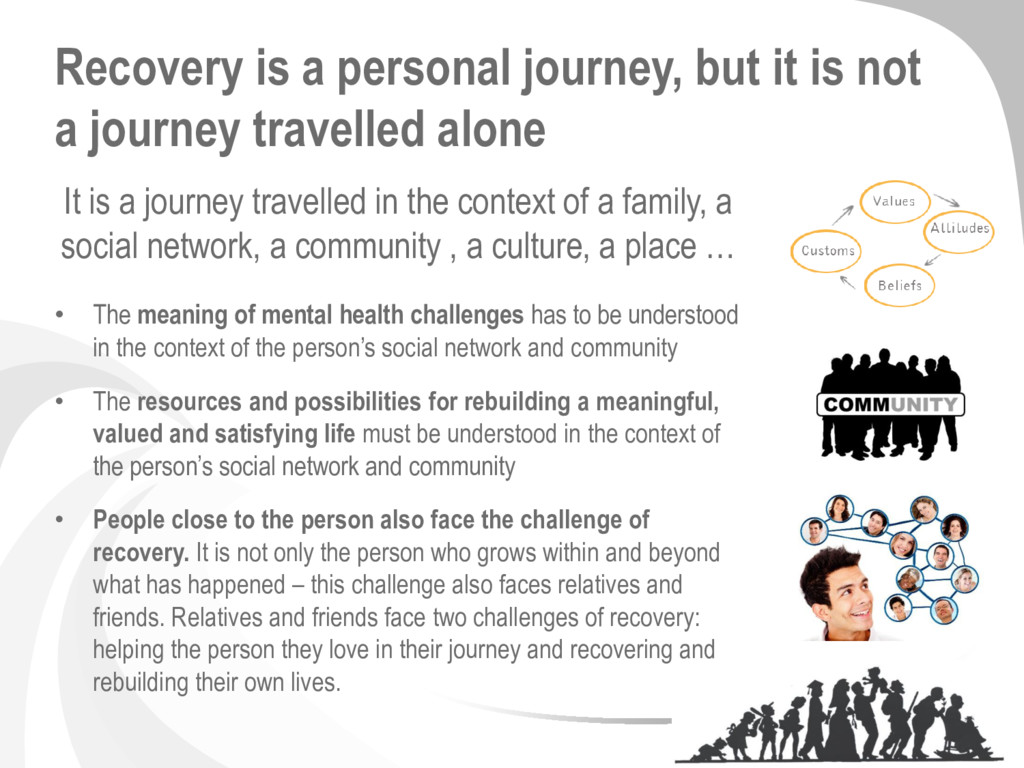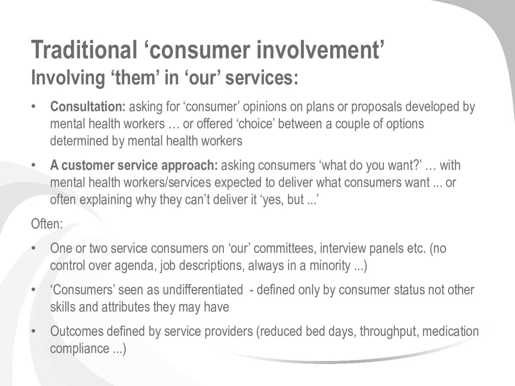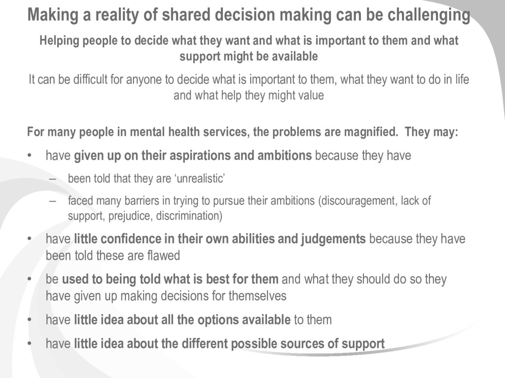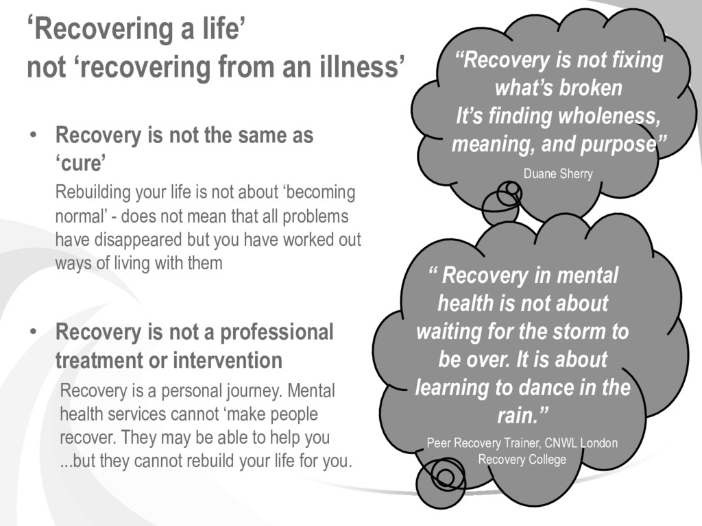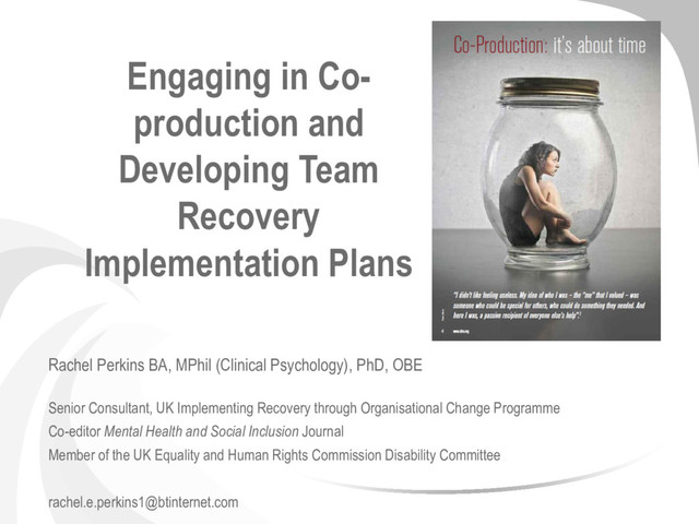 Perkins leads participants to explore and practice evidence-based processes such as co-production and Team Recovery Implementation Plans (TRIP) as tools to guide client-centred, self-directed practice. Perkins explores how services can move from more traditional ‘consumer involvement’ to genuine partnership/co-production in both design and delivery that brings together the professional and lived-experience expert on equal terms.