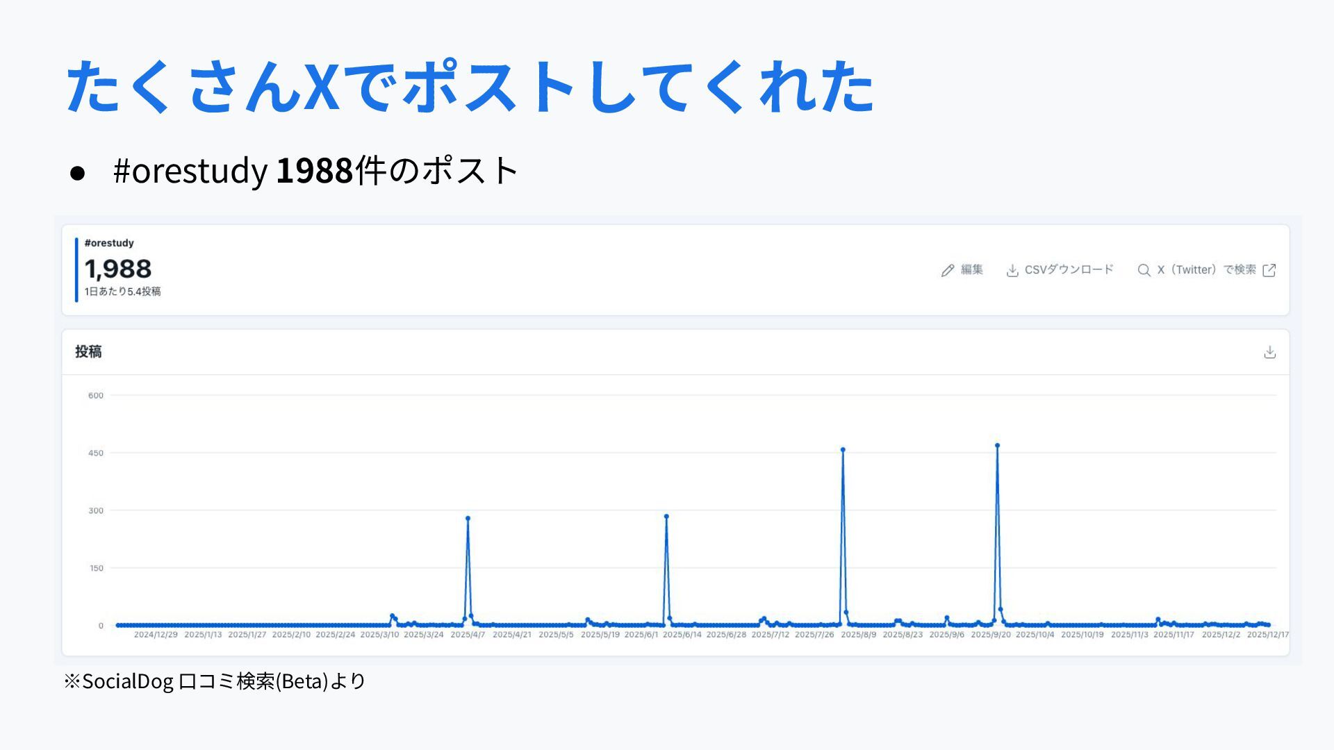 たくさんXでポストしてくれた • #orestudy 1988件のポスト ※SocialDog ⼝コミ検索(Beta)より
