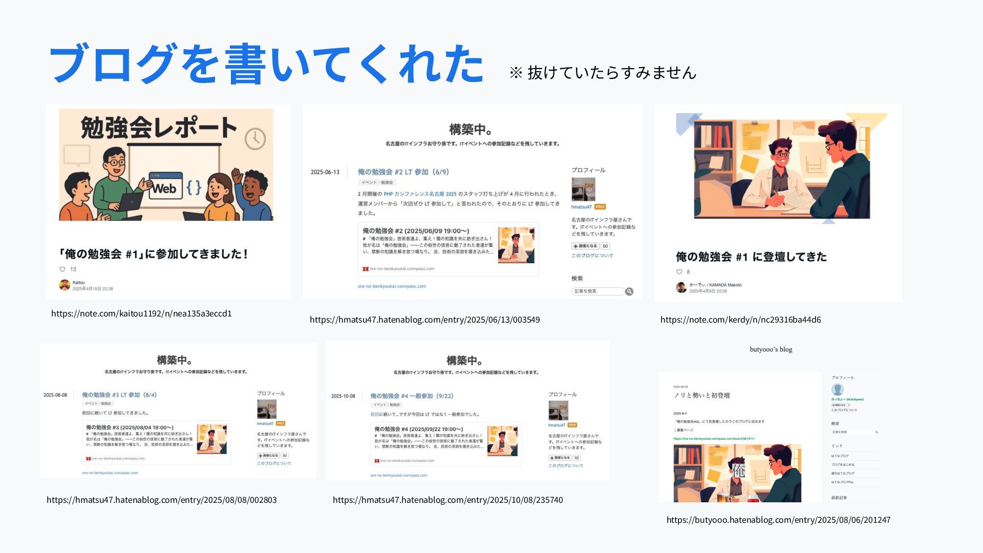 ブログを書いてくれた https://note.com/kaitou1192/n/nea135a3eccd1 https://hmatsu47.hatenablog.com/entry/2025/06/13/003549 https://note.com/kerdy/n/nc29316ba44d6 https://hmatsu47.hatenablog.com/entry/2025/10/08/235740 https://hmatsu47.hatenablog.com/entry/2025/08/08/002803 https://butyooo.hatenablog.com/entry/2025/08/06/201247 ※ 抜けていたらすみません
