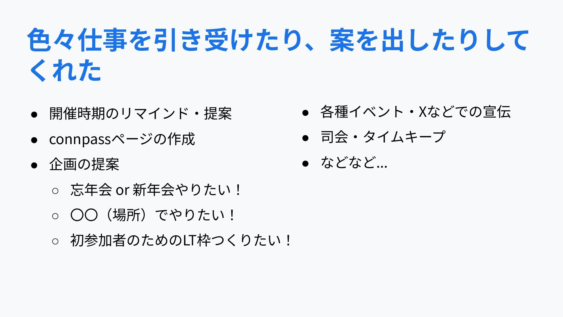⾊々仕事を引き受けたり、案を出したりして くれた • 開催時期のリマインド‧提案 • connpassページの作成 • 企画の提案 ◦ 忘年会