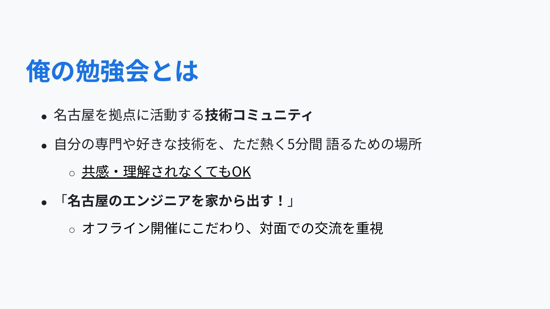 俺の勉強会とは 名古屋を拠点に活動する技術コミュニティ ⾃分の専⾨や好きな技術を、ただ熱く5分間 語るための場所 共感‧理解されなくてもOK 「名古屋のエンジニアを家から出す!」 オフライン開催にこだわり、対⾯での交流を重視