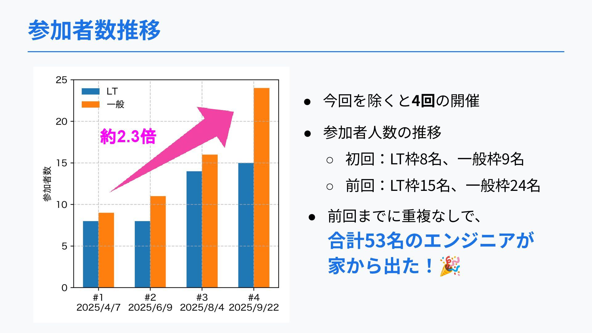 参加者数推移 約2.3倍 • 今回を除くと4回の開催 • 参加者⼈数の推移 ◦ 初回:LT枠8名、⼀般枠9名 ◦ 前回:LT枠15名、⼀般枠24名