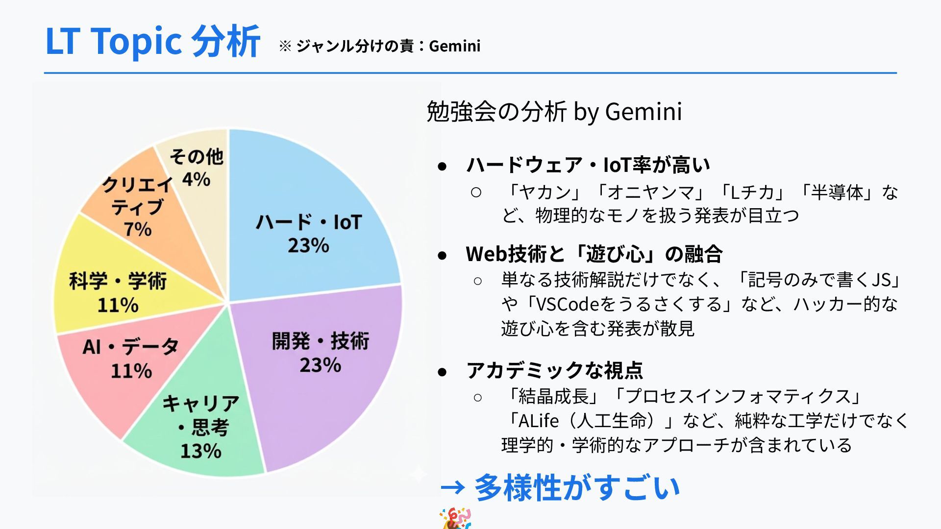 「ヤカン」「オニヤンマ」「Lチカ」「半導体」な ど、物理的なモノを扱う発表が⽬⽴つ • Web技術と「遊び⼼」の融合 ◦ 単なる技術解説だけでなく、「記号のみで書くJS」 や「VSCodeをうるさくする」など、ハッカー的な 遊び⼼を含む発表が散⾒ • アカデミックな視点 ◦ 「結晶成⻑」「プロセスインフォマティクス」 「ALife(⼈⼯⽣命)」など、純粋な⼯学だけでなく 理学的‧学術的なアプローチが含まれている 勉強会の分析 by Gemini