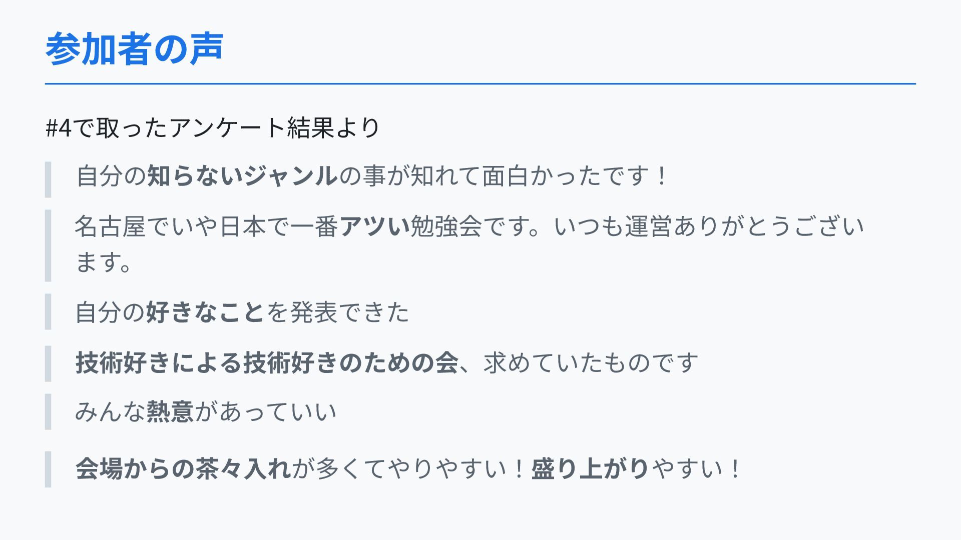 #4で取ったアンケート結果より ⾃分の知らないジャンルの事が知れて⾯⽩かったです! 名古屋でいや⽇本で⼀番アツい勉強会です。いつも運営ありがとうござい ます。 ⾃分の好きなことを発表できた 技術好きによる技術好きのための会、求めていたものです みんな熱意があっていい 参加者の声 会場からの茶々⼊れが多くてやりやすい!盛り上がりやすい!