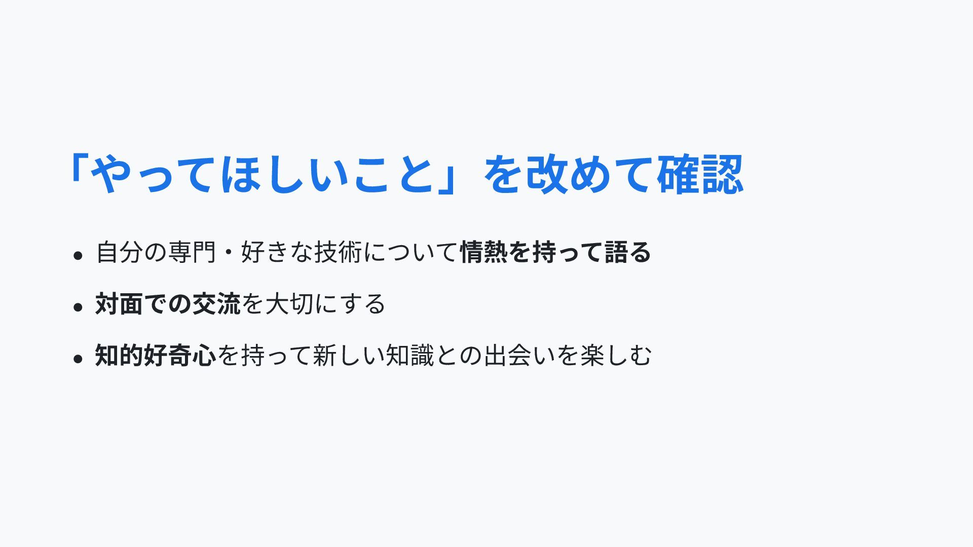 「やってほしいこと」を改めて確認 ⾃分の専⾨‧好きな技術について情熱を持って語る 対⾯での交流を⼤切にする 知的好奇⼼を持って新しい知識との出会いを楽しむ