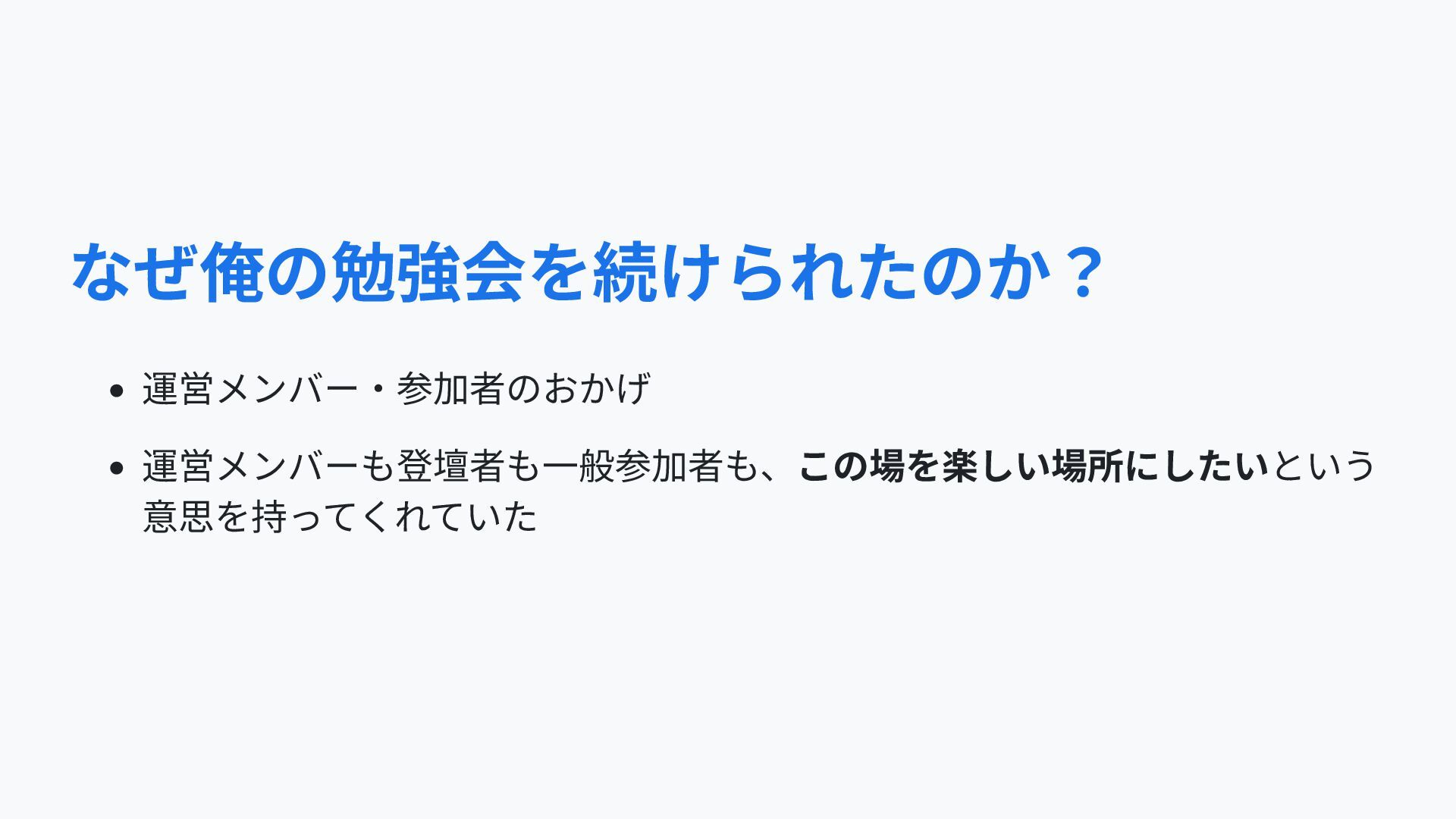 なぜ俺の勉強会を続けられたのか? 運営メンバー‧参加者のおかげ 運営メンバーも登壇者も⼀般参加者も、この場を楽しい場所にしたいという 意思を持ってくれていた