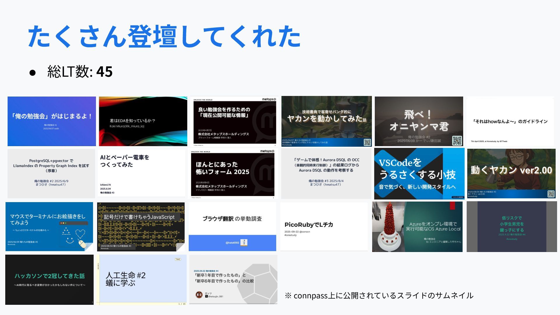 たくさん登壇してくれた • 総LT数: 45 ※ connpass上に公開されているスライドのサムネイル