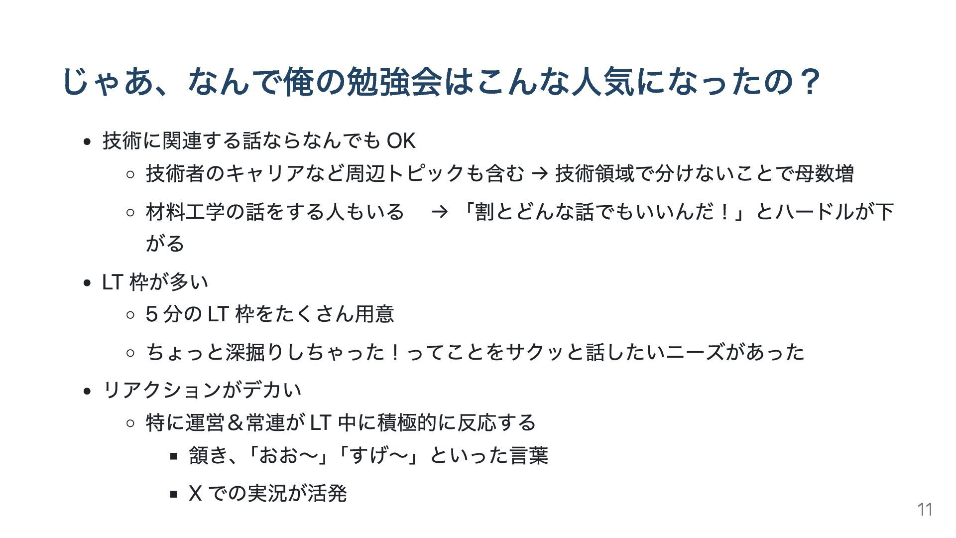 LT 枠が多い 5 分の LT 枠をたくさん用意 ちょっと深掘りしちゃった!ってことをサクッと話したいニーズがあった リアクションがデカい 特に運営&常連が LT 中に積極的に反応する 頷き、 「おお〜」 「すげ〜」といった言葉 X での実況が活発 11