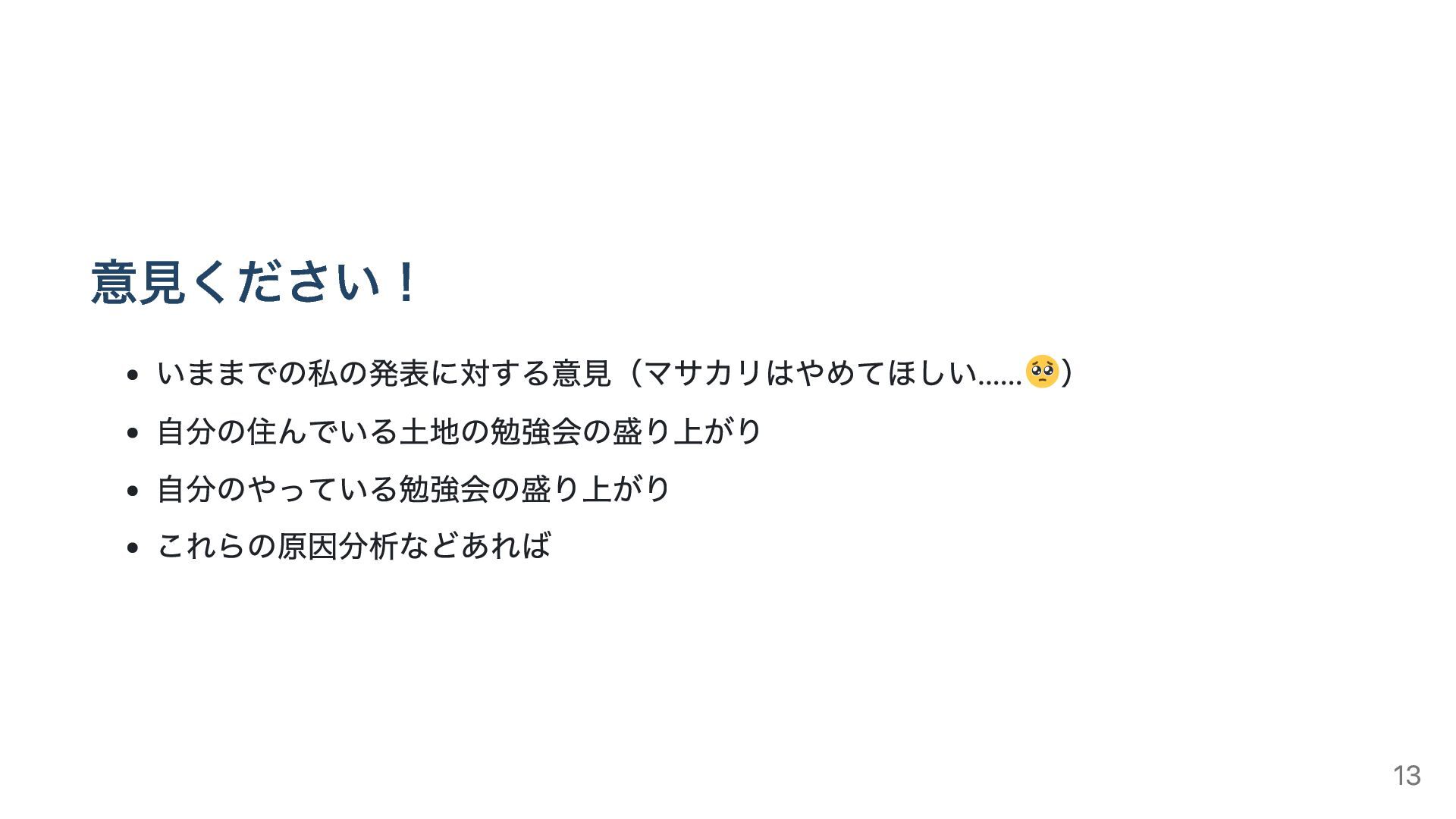 意見ください! いままでの私の発表に対する意見(マサカリはやめてほしい...... ) 自分の住んでいる土地の勉強会の盛り上がり 自分のやっている勉強会の盛り上がり これらの原因分析などあれば 13
