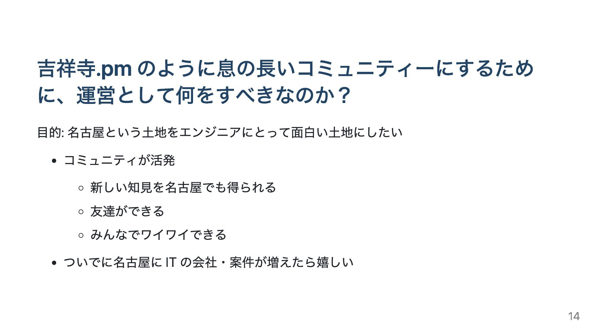 吉祥寺.pm のように息の長いコミュニティーにするため に、運営として何をすべきなのか? 目的: 名古屋という土地をエンジニアにとって面白い土地にしたい コミュニティが活発 新しい知見を名古屋でも得られる 友達ができる みんなでワイワイできる ついでに名古屋に